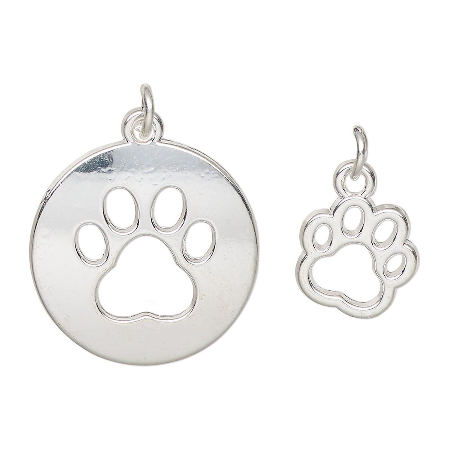 Charm, silver-finished "pewter" (zinc-based alloy) and steel, 22.5mm round with paw cutout design and 13x11.5mm single-sided paw. Sold per pkg of (2) 2-piece sets.