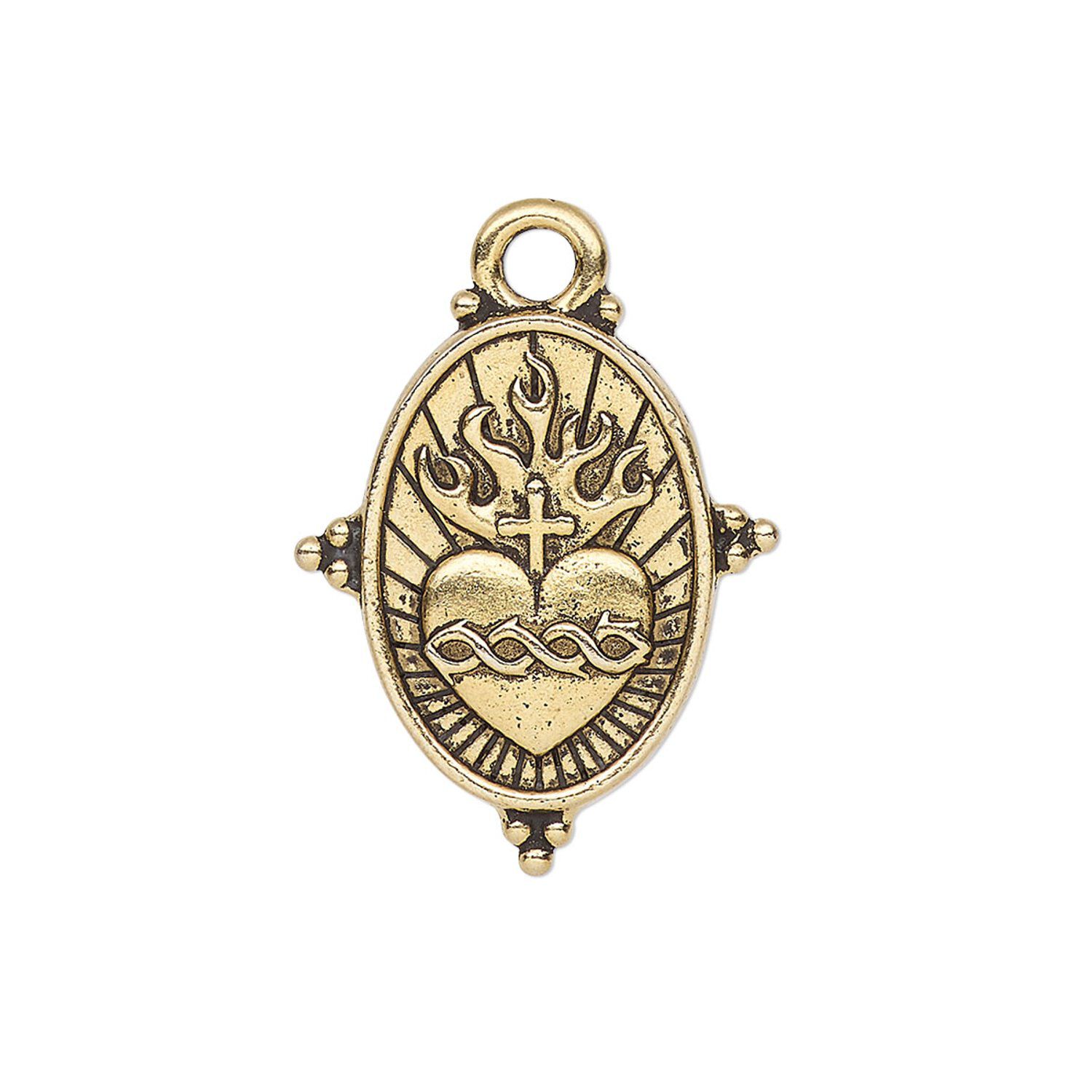 Drop, TierraCast®, antique gold-plated pewter, 25x21mm 2-sided beaded oval with sacred heart. Sold individually.
