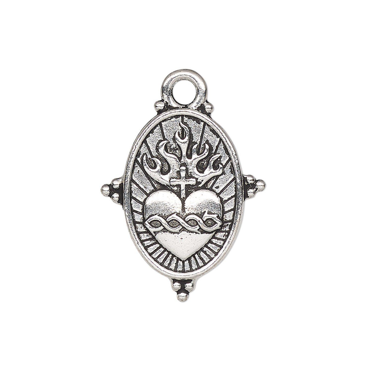 Drop, TierraCast®, antique silver-plated pewter, 25x21mm 2-sided beaded oval with sacred heart. Sold individually.