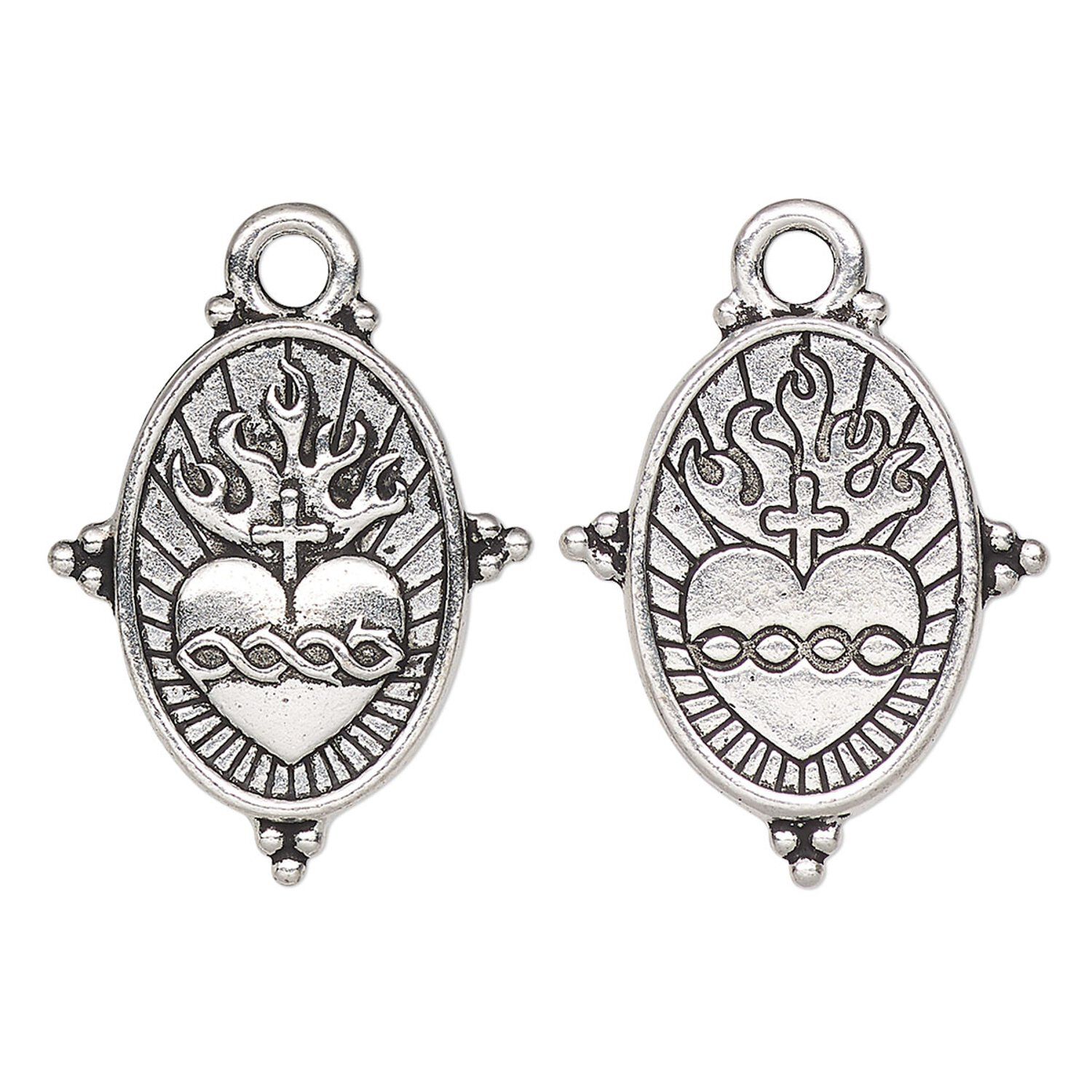 Drop, TierraCast®, antique silver-plated pewter, 25x21mm 2-sided beaded oval with sacred heart. Sold per pkg of 10.