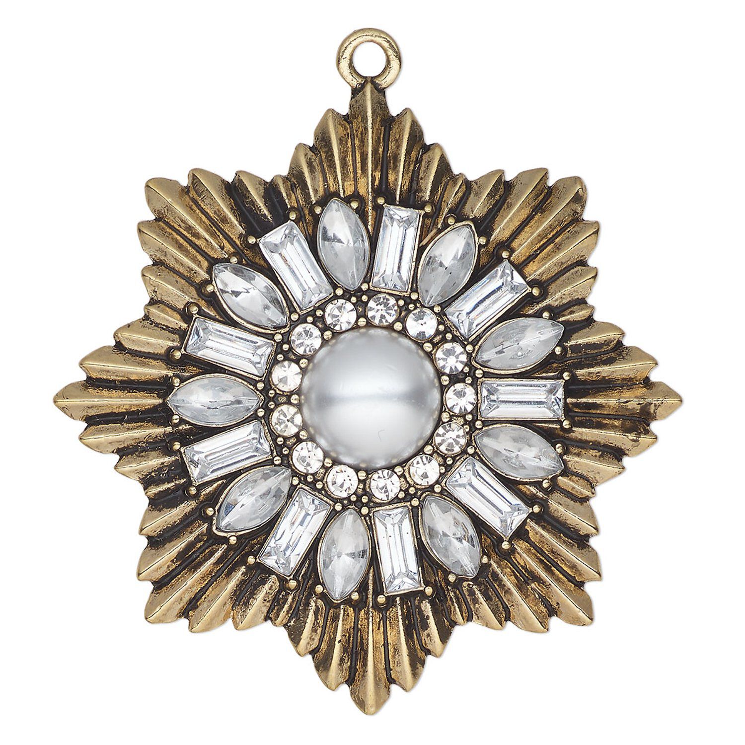 Focal, antique gold-finished "pewter" (zinc-based alloy) and glass, clear / white, 2-1/4x2-1/4-inch single-sided star with glass pearl and glass chatons. Sold individually.