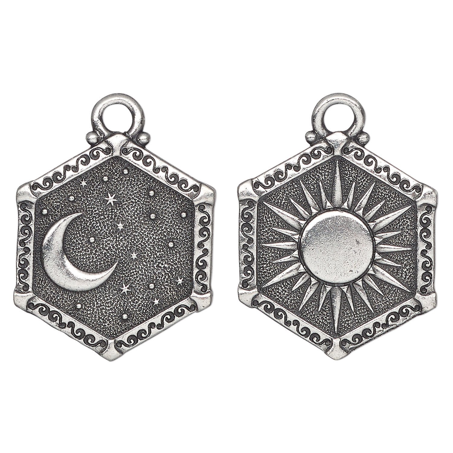 Charm, TierraCast®, "Celestial" collection, pewter (tin-based alloy), 24.5x21.5mm, 2-sided hexagon with sun and moon design. Sold per pkg of 10.
