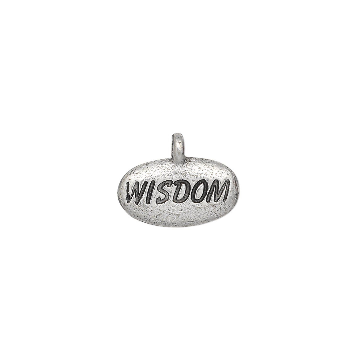 Charm, antiqued pewter (tin-based alloy), 15x9mm "WISDOM" pebble. Sold per pkg of 2.