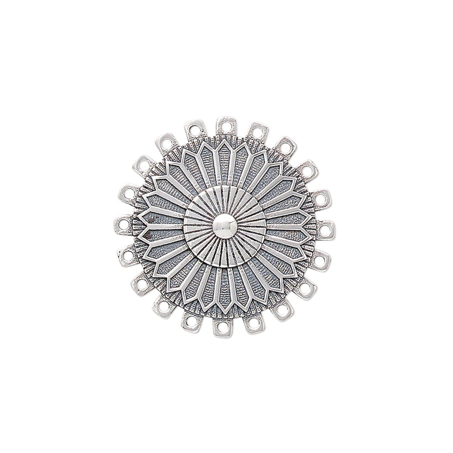 Sterling silver concho-inspired drop features intricate details and (20) loops. Ideal for southwestern, Old West or steampunk creations, it has been antiqued to enhance the front design. This versatile component offers many design opportunities: add a jump ring to use as a charm, combine as links to chain for central focals, add wire-wrapped dangles for a pendant with dynamic movement and more.