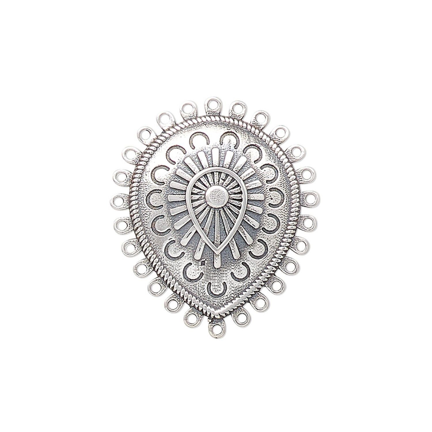Sterling silver concho-inspired drop features intricate details and (26) loops. Ideal for southwestern, Old West or steampunk creations, it has been antiqued to enhance the front design. This versatile component offers many design opportunities: add a jump ring to use as a charm, combine as links to chain for central focals, add wire-wrapped dangles for a pendant with dynamic movement and more.