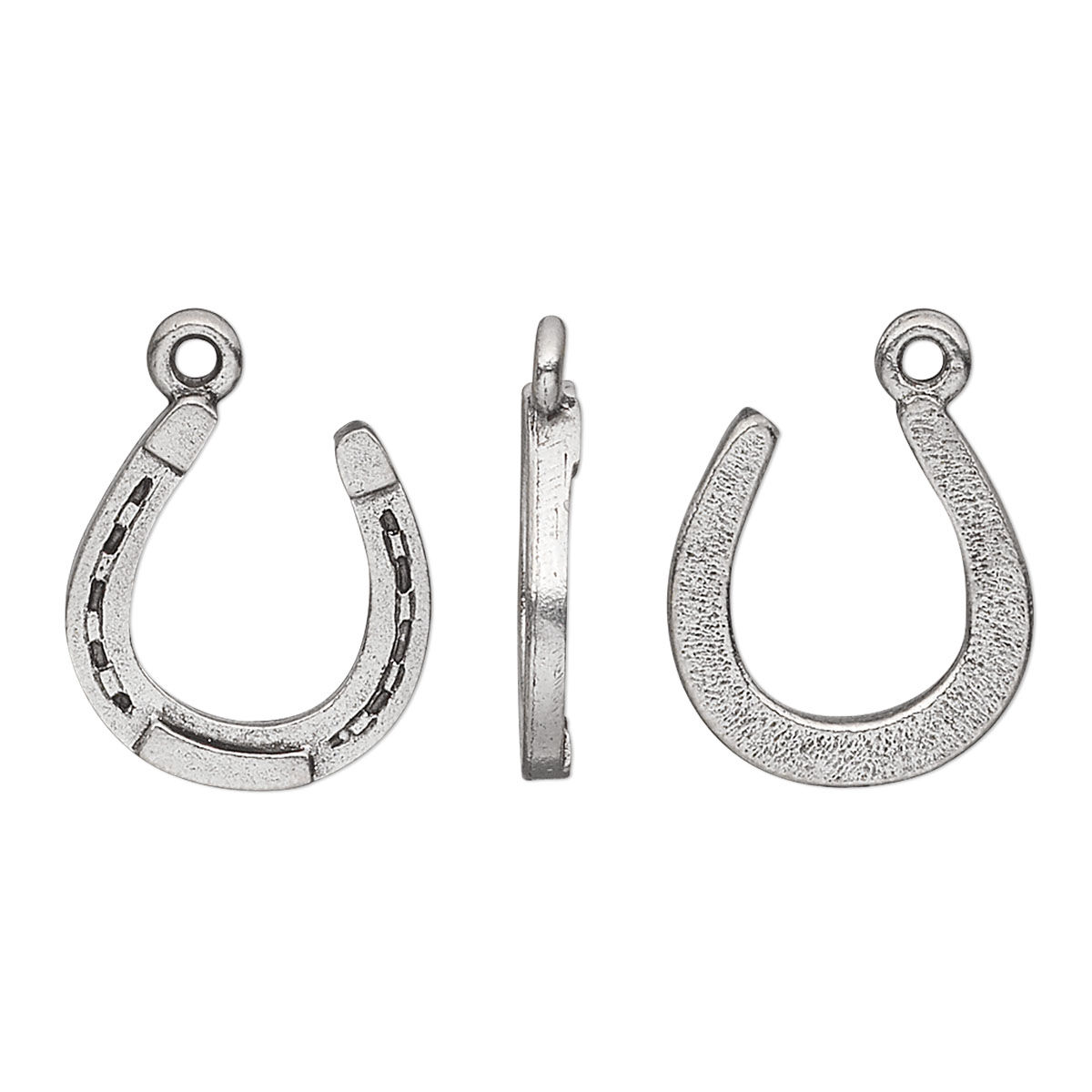 This horseshoe charm showcases intricate detail. Pewter (tin-based alloy) charms are affordable components for creating and selling jewelry designs. The antiqued finish creates a popular aged or vintage look. Add a jump ring or split ring to attach to charm bracelets, necklace chains, earwires and more.
