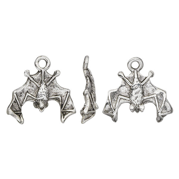 This spooky 2-sided bat charm showcases intricate detail. Pewter (tin-based alloy) charms are affordable components for creating and selling jewelry designs. The antique silver plating creates a popular aged or vintage look. Add a jump ring or split ring to attach to charm bracelets, necklace chains, earwires and more.