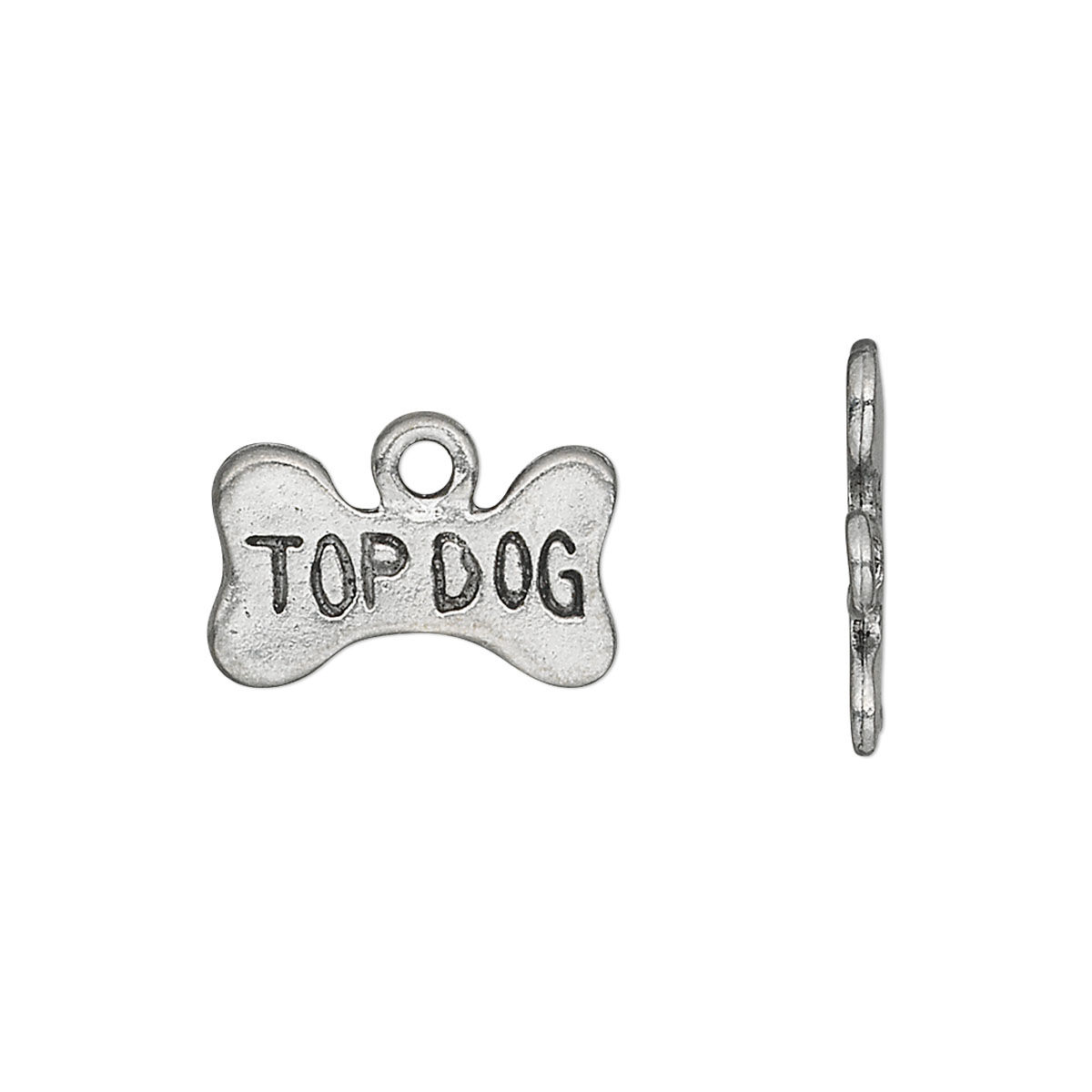 This dog bone charm showcases intricate detail and shows just who is "TOP DOG." Pewter (tin-based alloy) charms are affordable components for creating and selling jewelry designs. The antiqued finish creates a popular aged or vintage look. Hollowed out back reduces weight. Add a jump ring or split ring to attach to charm bracelets, necklace chains, earwires and more.