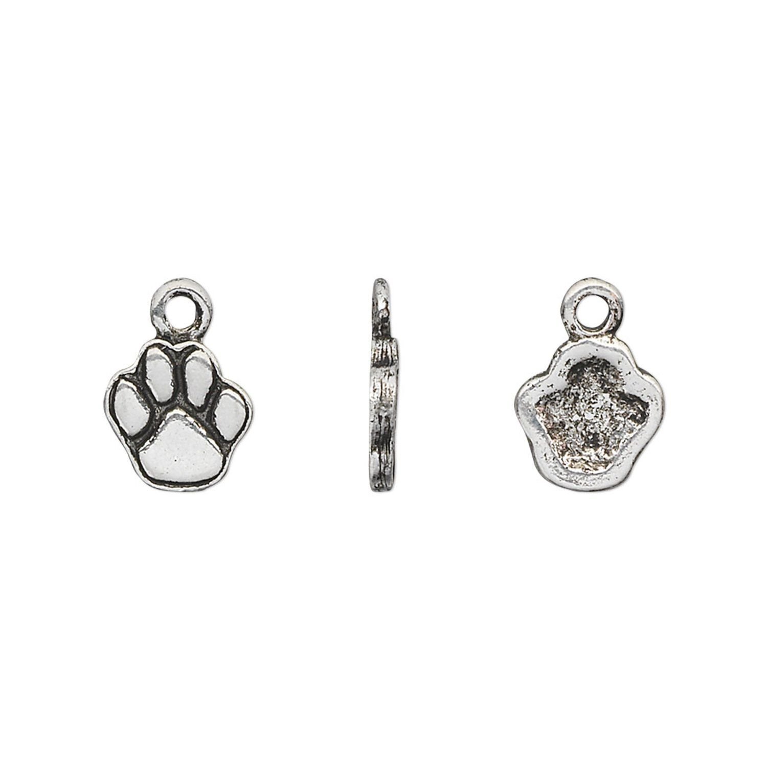 This single-sided paw print charm showcases intricate detail. Pewter (tin-based alloy) charms are affordable components for creating and selling jewelry designs. The antique silver plating creates a popular aged or vintage look. Hollowed out back reduces weight. Add a jump ring or split ring to attach to charm bracelets, necklace chains, earwires and more.