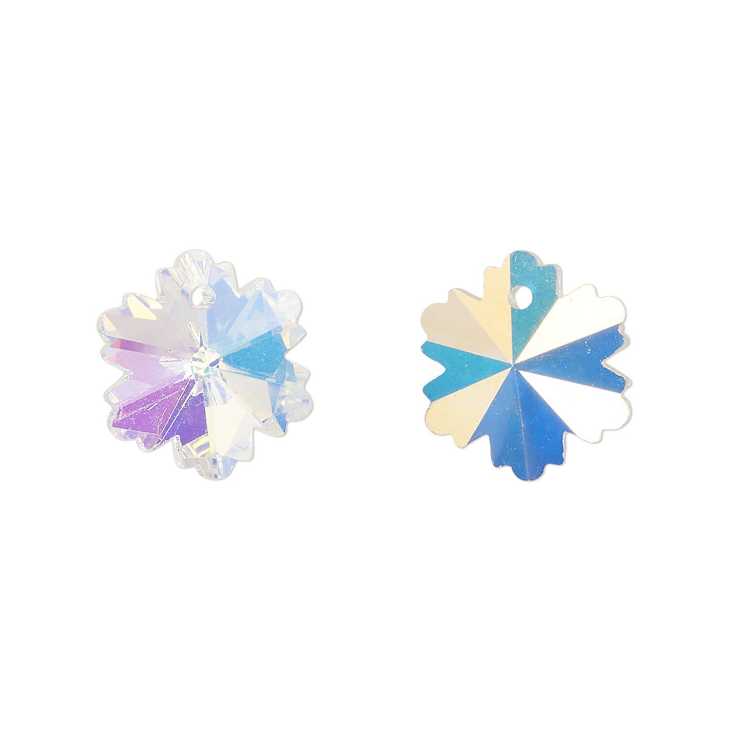 Drop, glass, translucent clear AB, 14mm snowflake. Sold per pkg of 10.