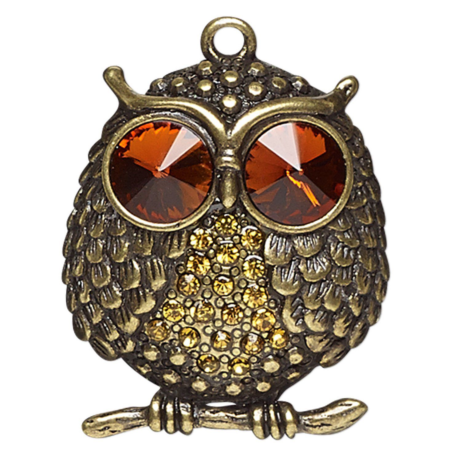 Focal, glass rhinestone and antiqued brass-finished "pewter" (zinc-based alloy), orange and golden yellow, 38x33mm owl. Sold individually.