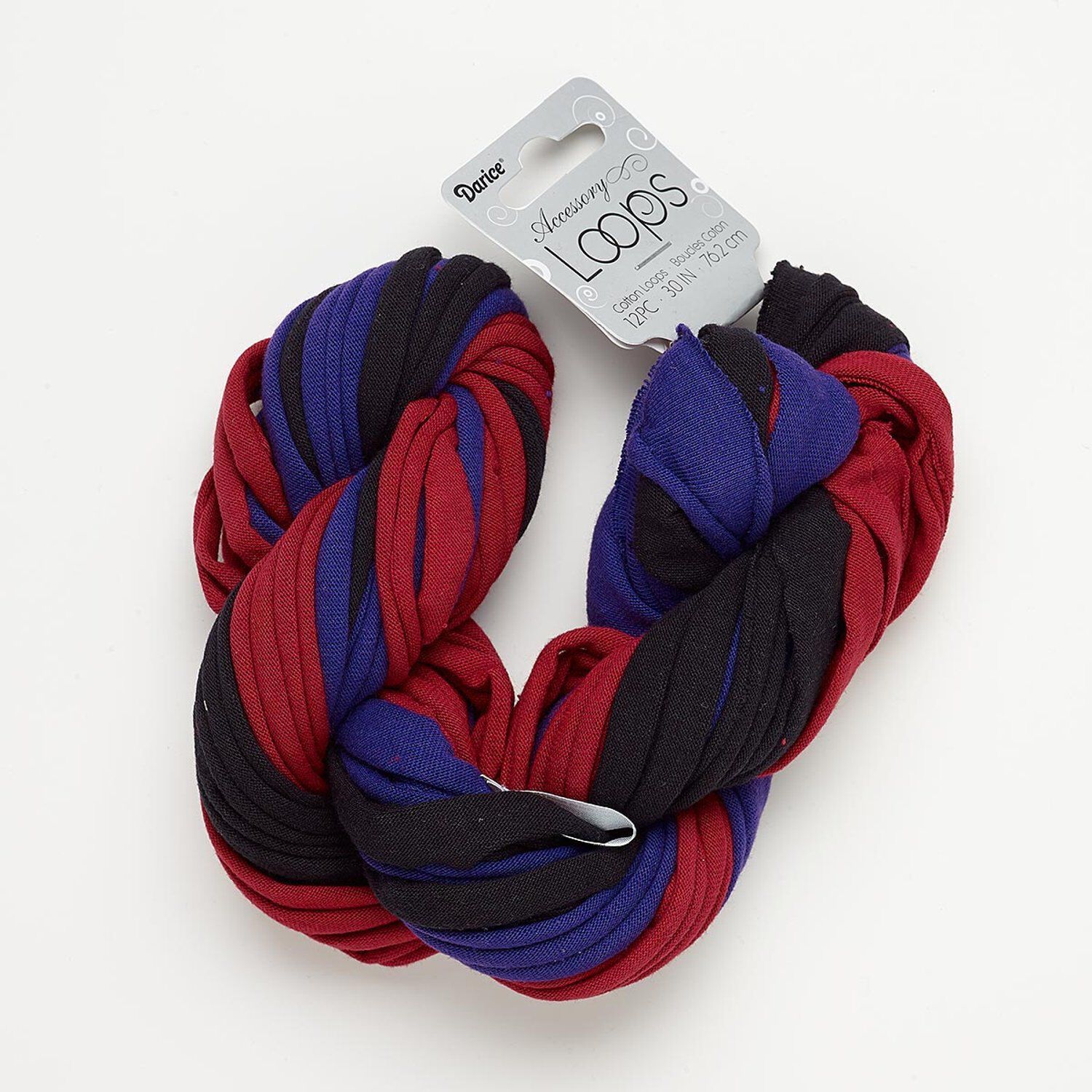 Cord, tee shirt, cotton (dyed) and silver-finished steel, black / burgundy / purple, 20-24mm wide with 44mm ring, 30-inch continuous loop. Sold per pkg of 12.