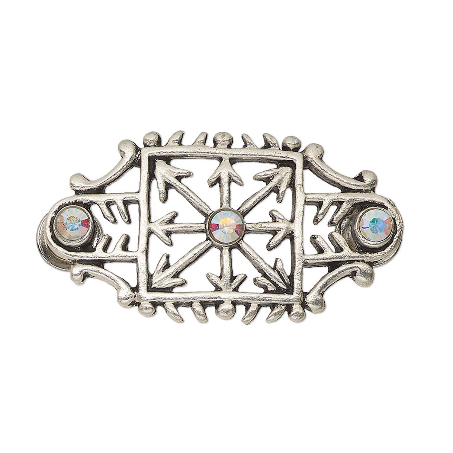 Focal, glass rhinestone with antiqued silver-finished steel and "pewter" (zinc-based alloy), clear AB, 34x18mm with cutout design and (2) screw fasteners. Sold individually.