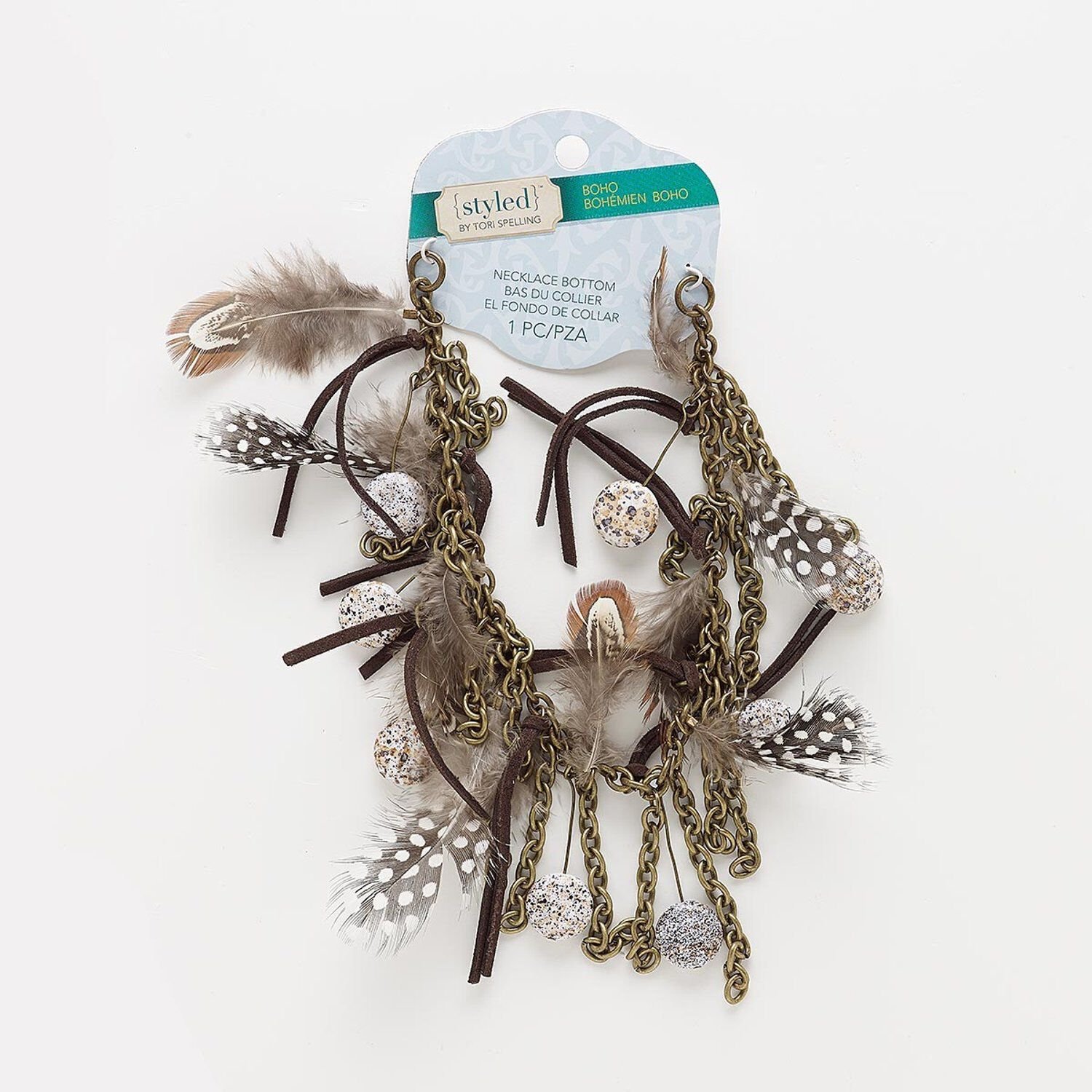 Necklace component, feather (natural) / leather (dyed) / antiqued brass-finished steel, brown / white / black, 12-1/2 inches. Sold individually.