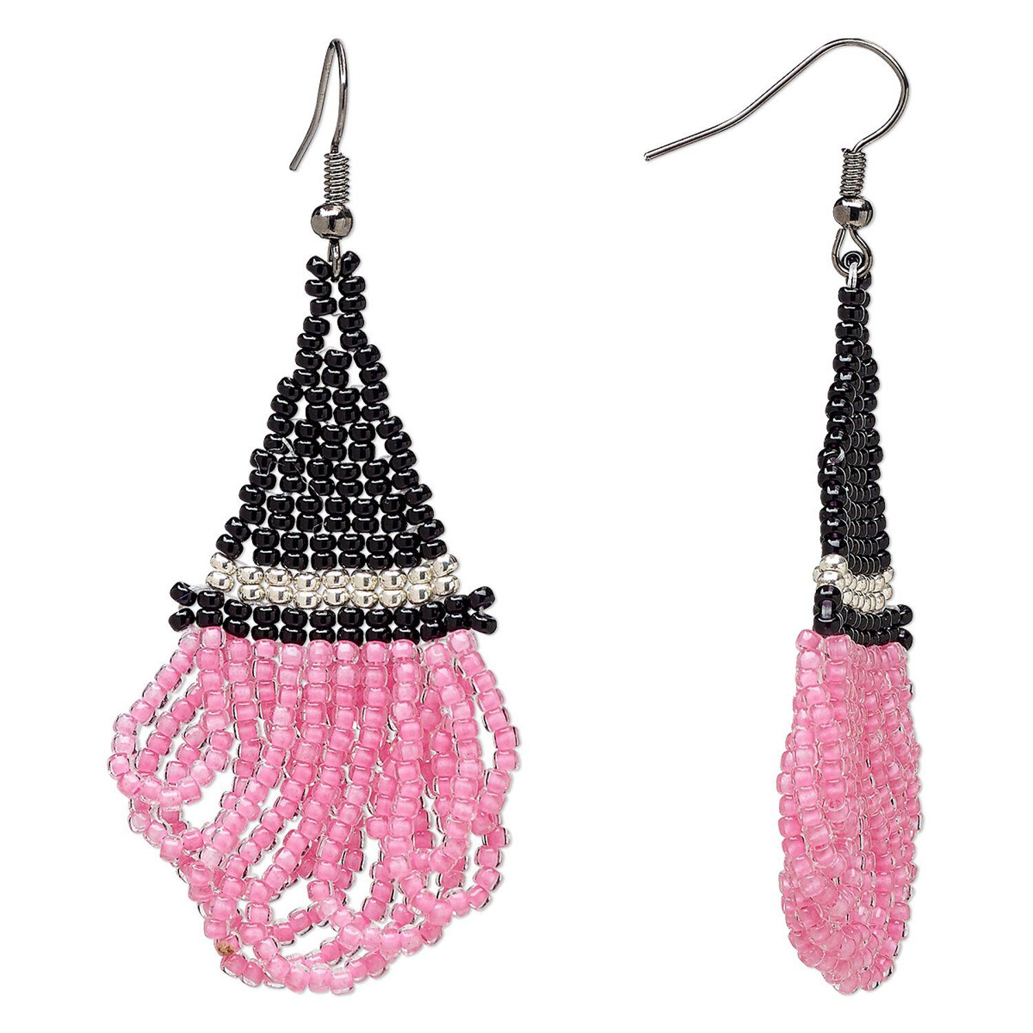 Circle of Hope earring, seed beads and electro-coated steel, pink and black, 2-3/4 inch witch's hat with fishhook ear wire. Only one pair available.