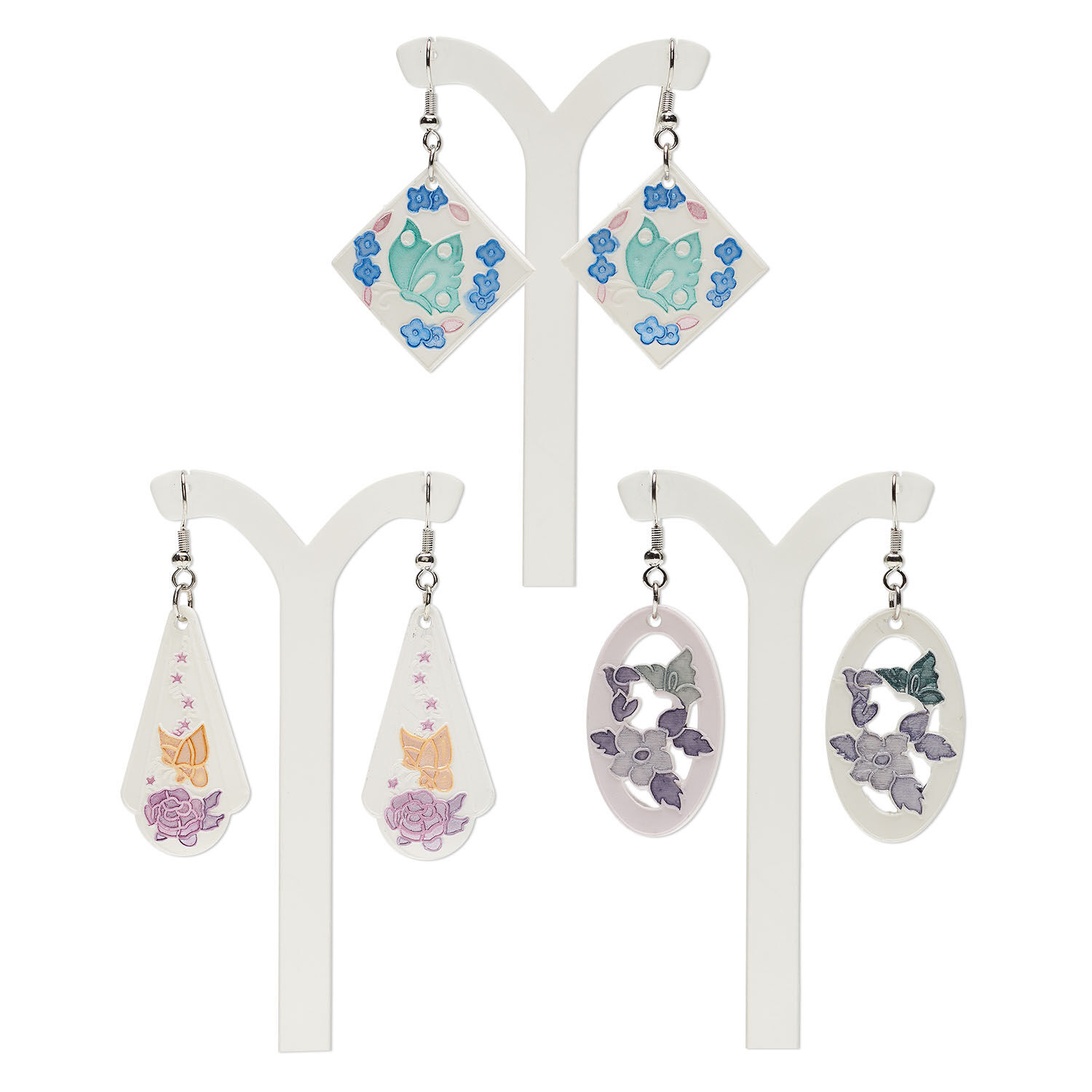 Earring mix, Everyday Jewelry, silver finish steel / glass / porcelain, multicolored, 20mm-50x25mm multi-shape with fishhook ear wire. Sold per pkg of 3 pairs.