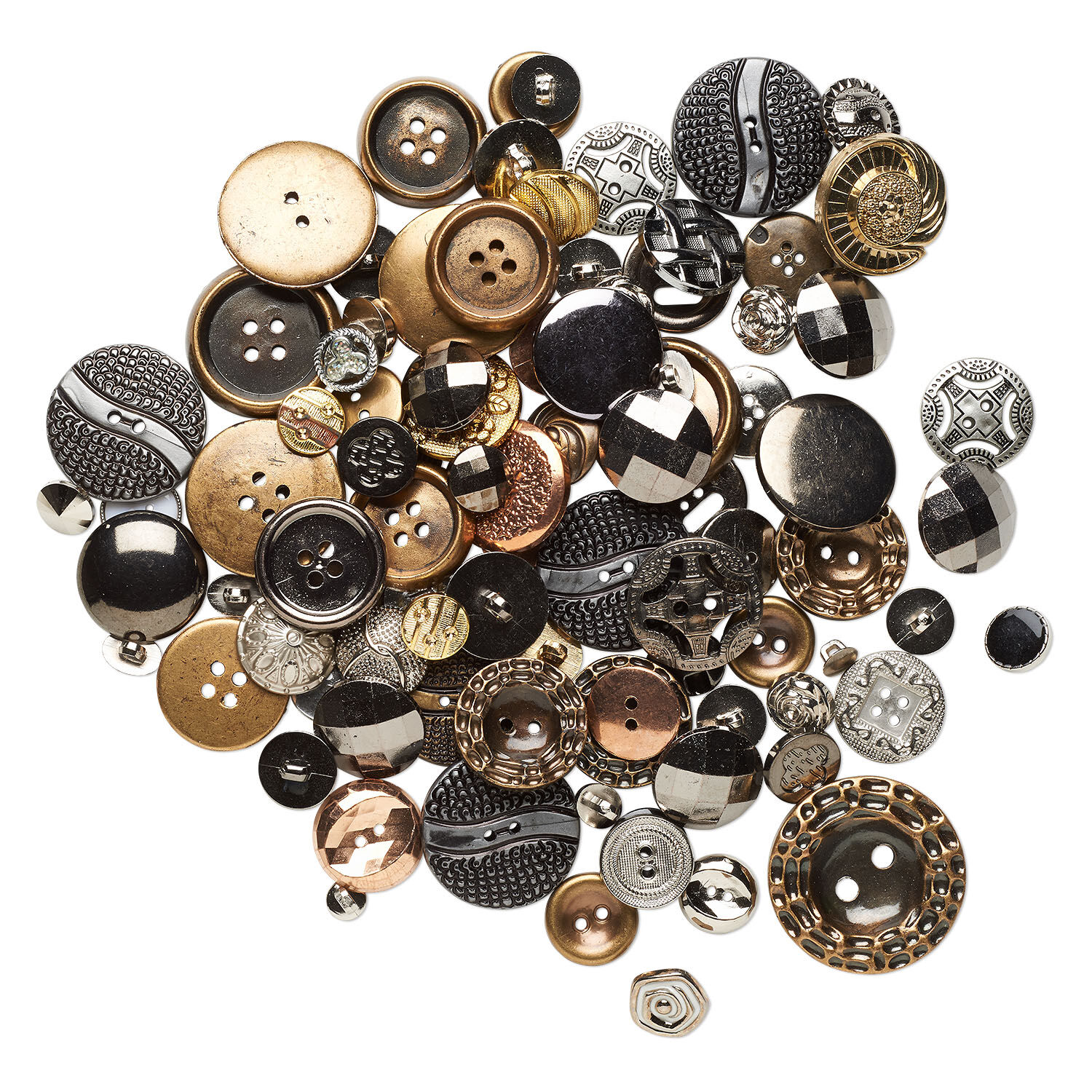 Button mix, resin and acrylic, mixed metallic colors, 8-50mm mixed shape. Sold per 1/4 pound pkg, approximately 95 to100 buttons.