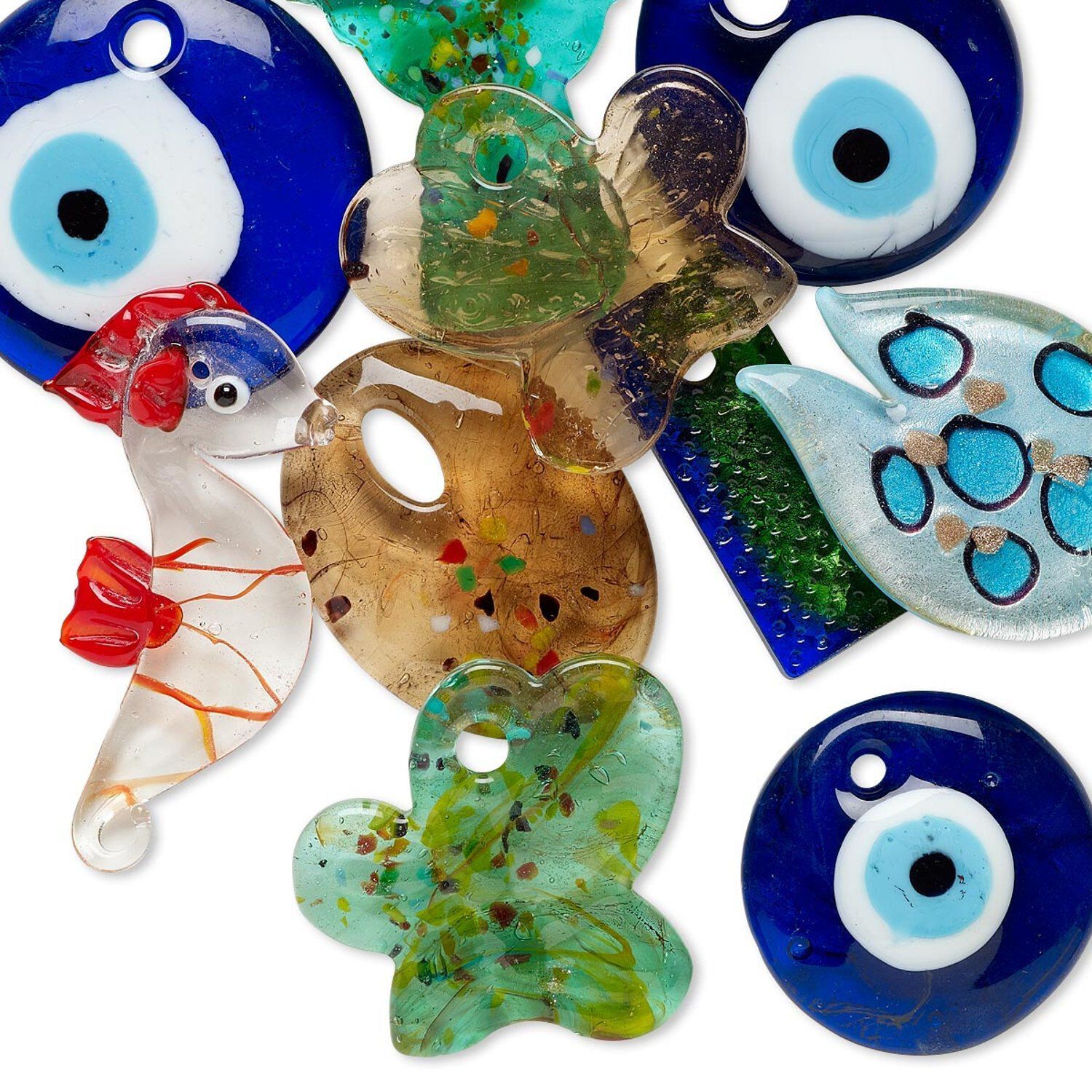 Colors can include clear, teal, honey and more. Shapes can include seahorse, puffed flat round, flat rectangle and more. Package can include silver-colored foil. Designs can include confetti dots, two tone and more. Items are made with solid color glass, which means the base color of the glass is saturated throughout the object and will not fade or rub off over time. Sizes, shapes and colors may vary with handcrafted items.