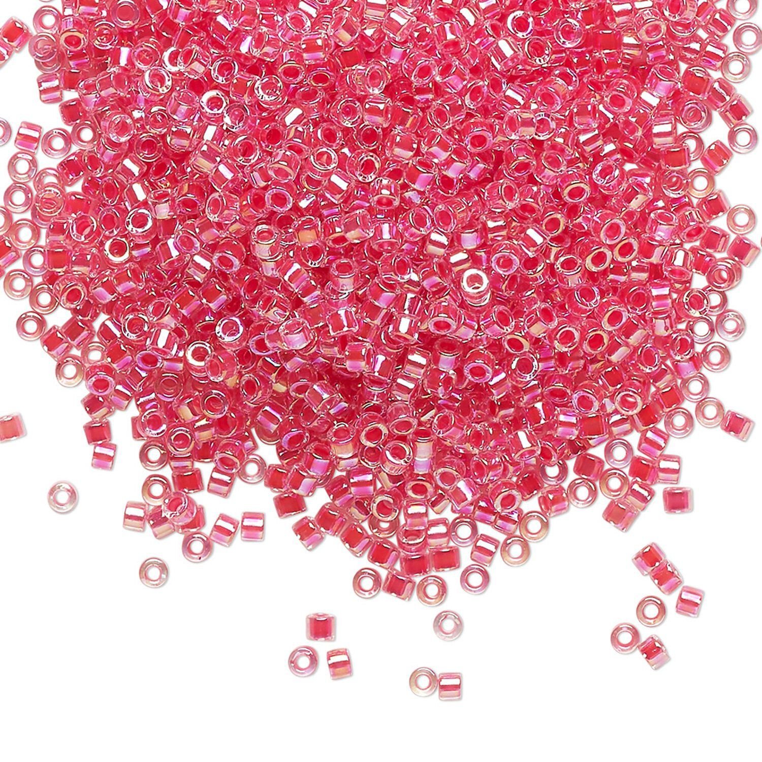 Seed bead, Delica®, glass, pkg/50g, #11 round, translucent dark coral-lined rainbow crystal clear (DB-0075).