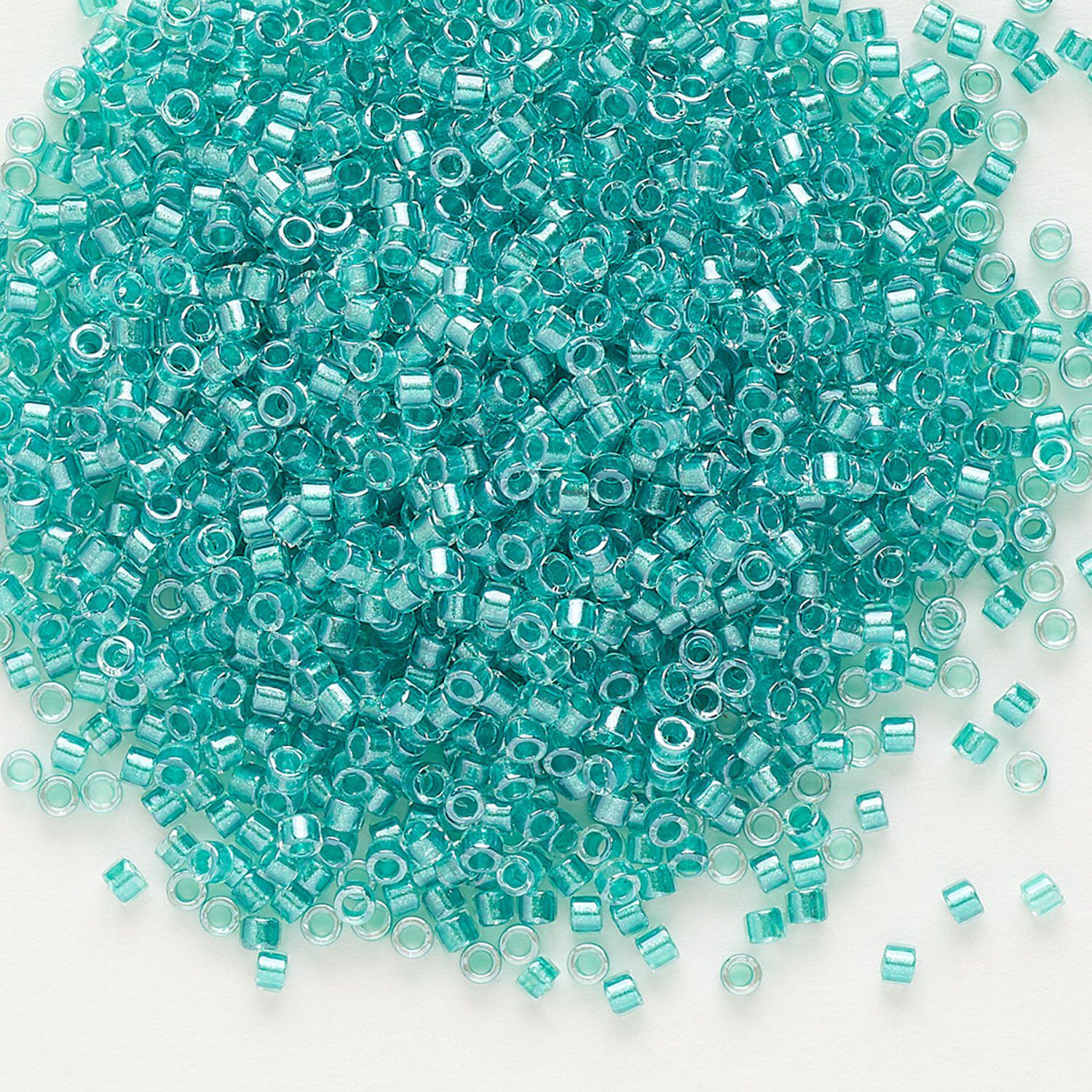 Seed bead, Delica®, glass, pkg/250g, #11 round, translucent teal green-lined luster crystal clear (DB-0904).