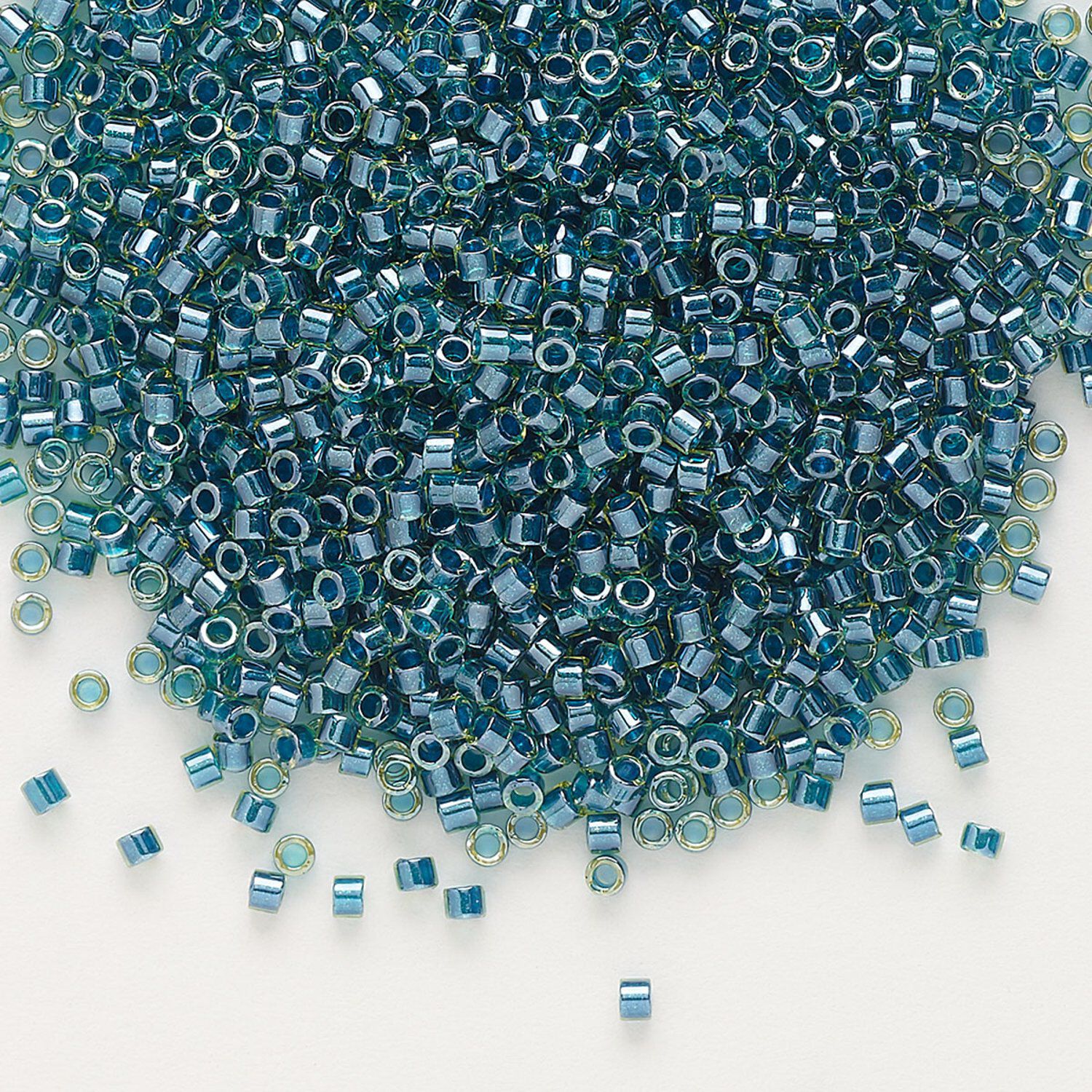 Seed bead, Delica®, glass, pkg/50g, #11 round, translucent dark teal-lined luster chartreuse (DB-0919).