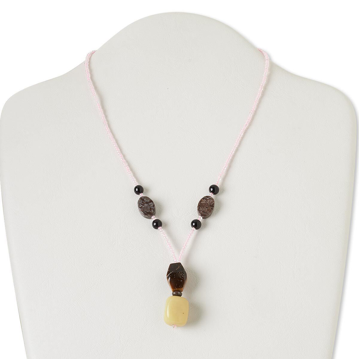 Materials can include olive new "jade," tigereye, brown snowflake jasper and red agate. Glass beads can have an AB finish.