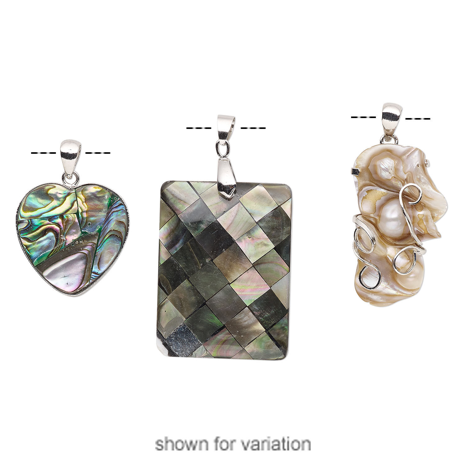 Materials can include mother-of-pearl shell, gold lip shell, black lip shell and paua shell. Shapes can include heart, carved flower, rectangle, oval, teardrop and more. Testing for colorfastness is recommended.