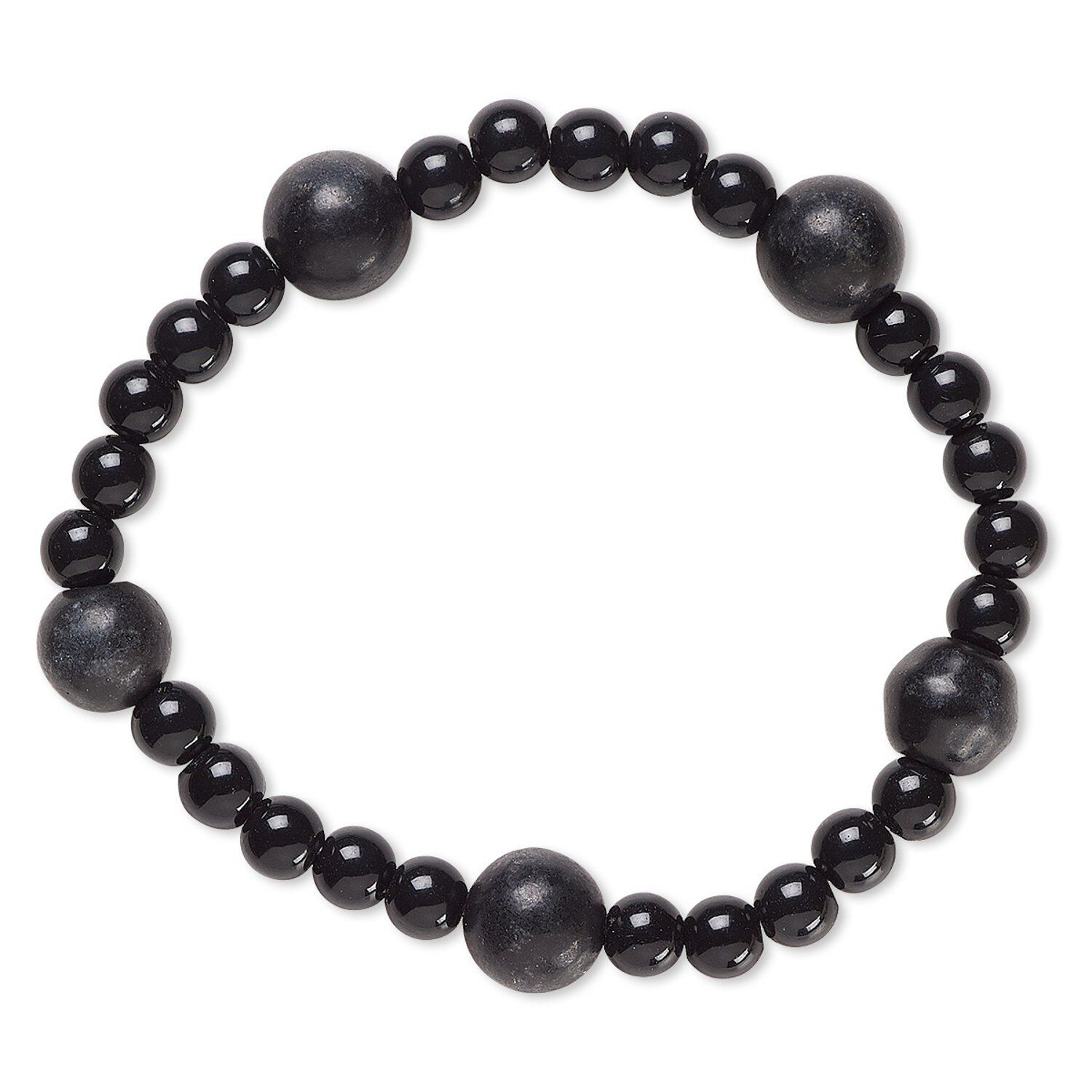 Bracelet, stretch, blackstone (dyed) and acrylic, black, 5mm and 9-10mm round, 6 inches. Sold individually.