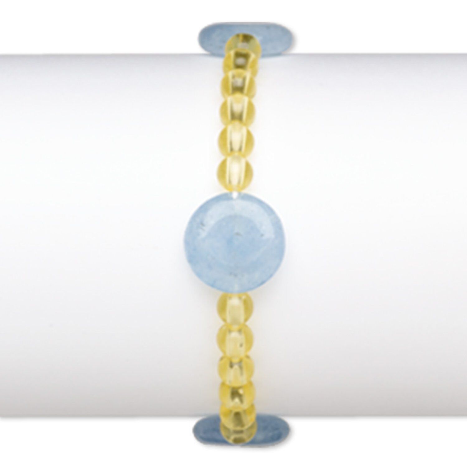 Bracelet, stretch, quartz (dyed) and acrylic, yellow and blue, 5mm round and 16mm puffed flat round, 7 inches. Sold individually.