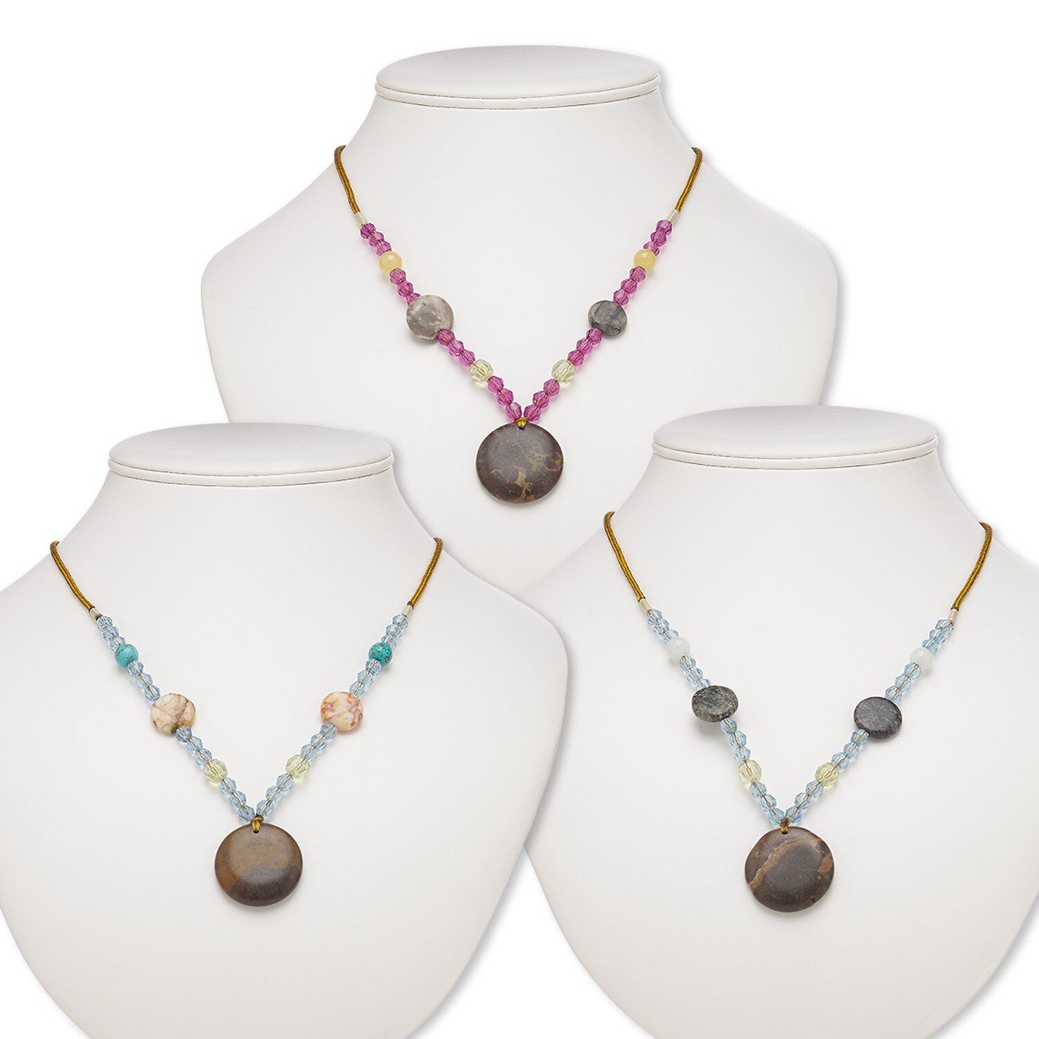 Multi-gemstone / acrylic / glass 1pkg3, round pendant necklace mix continuous loop 20 inch 29-30mm