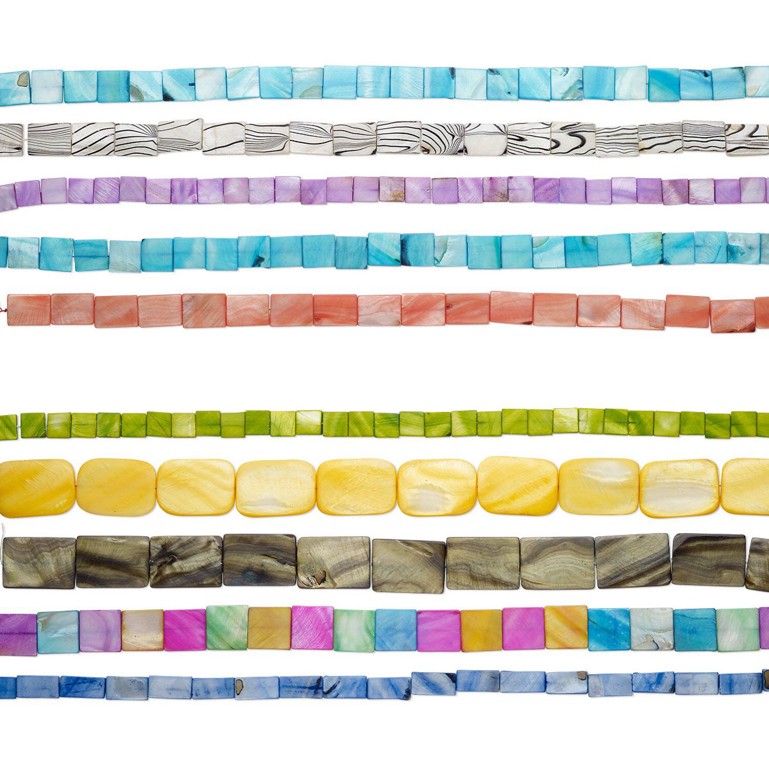 Bead mix, mother-of-pearl shell (dyed / coated), mixed colors, 7x6mm-38x27mm flat square and flat rectangle, Mohs hardness 3-1/2. Sold per pkg of (5) 14- to 15" to 16" strands.