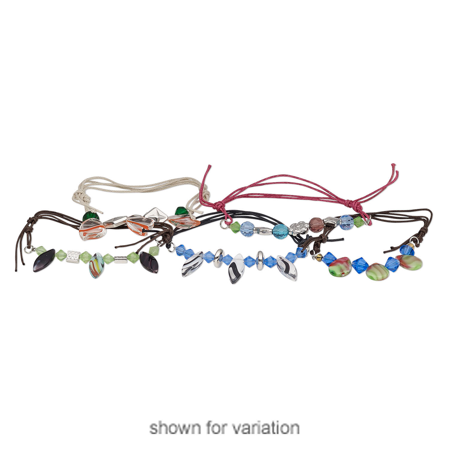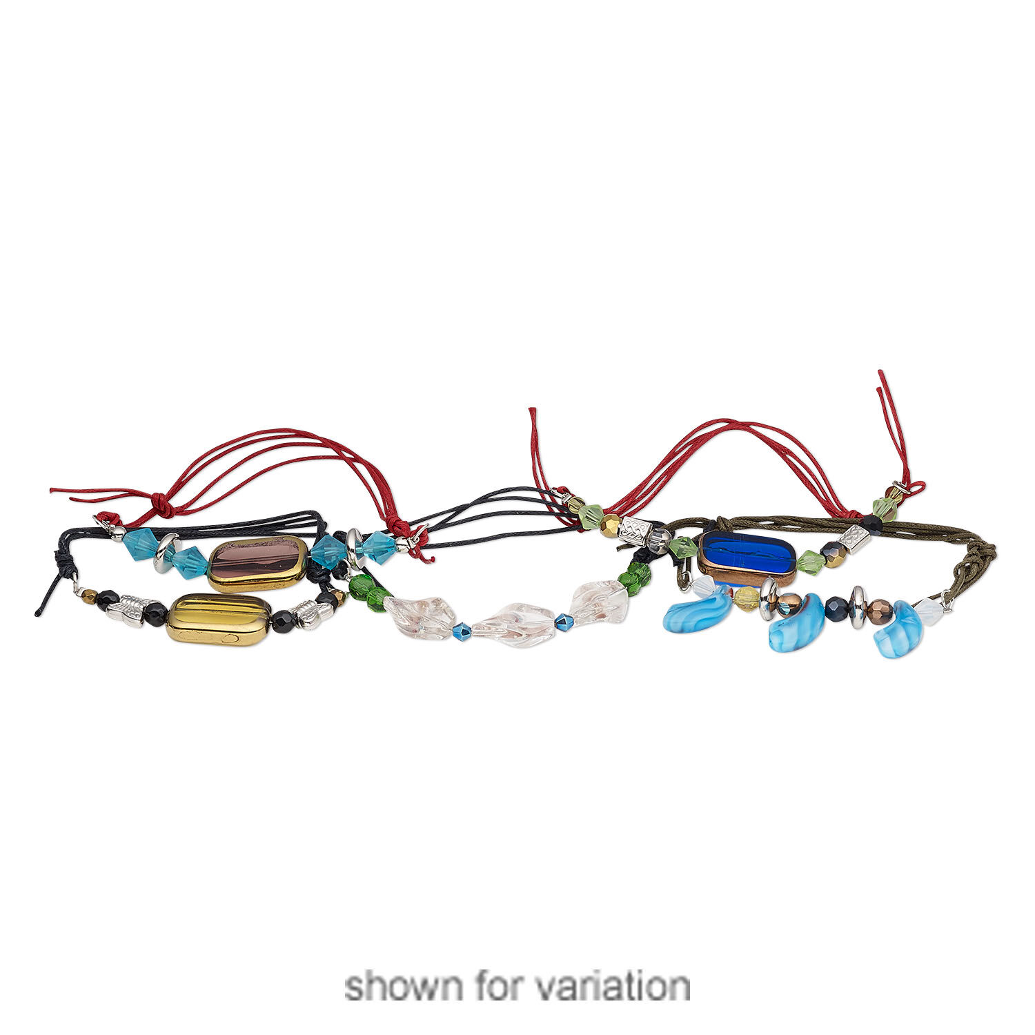 Bracelet mix, waxed cotton cord / glass / silver-finished steel / gold- / silver-coated acrylic, multicolored, 4mm-30x20mm mixed shape, adjustable from 7-1/2 to 9 inches with slip knot closure. Sold per pkg of 5.