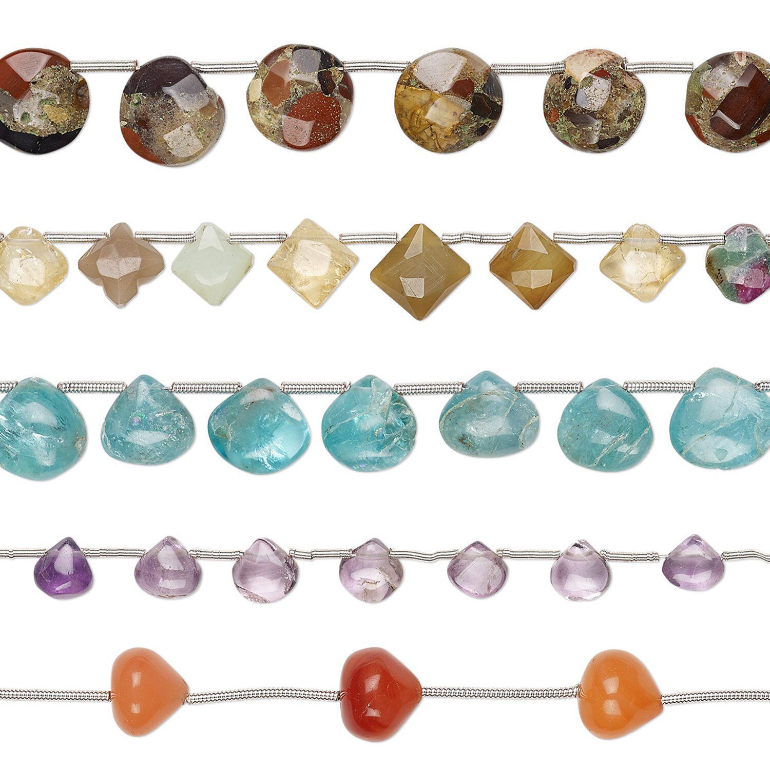 Materials can include labradorite, smoky quartz, amethyst and more. Shapes can include top-drilled faceted teardrop, top-drilled faceted diamond, faceted puffed flat round and more. Sizes, shapes and colors may vary with handcrafted items. Beads are temporarily strung with spacers to protect against chipping.