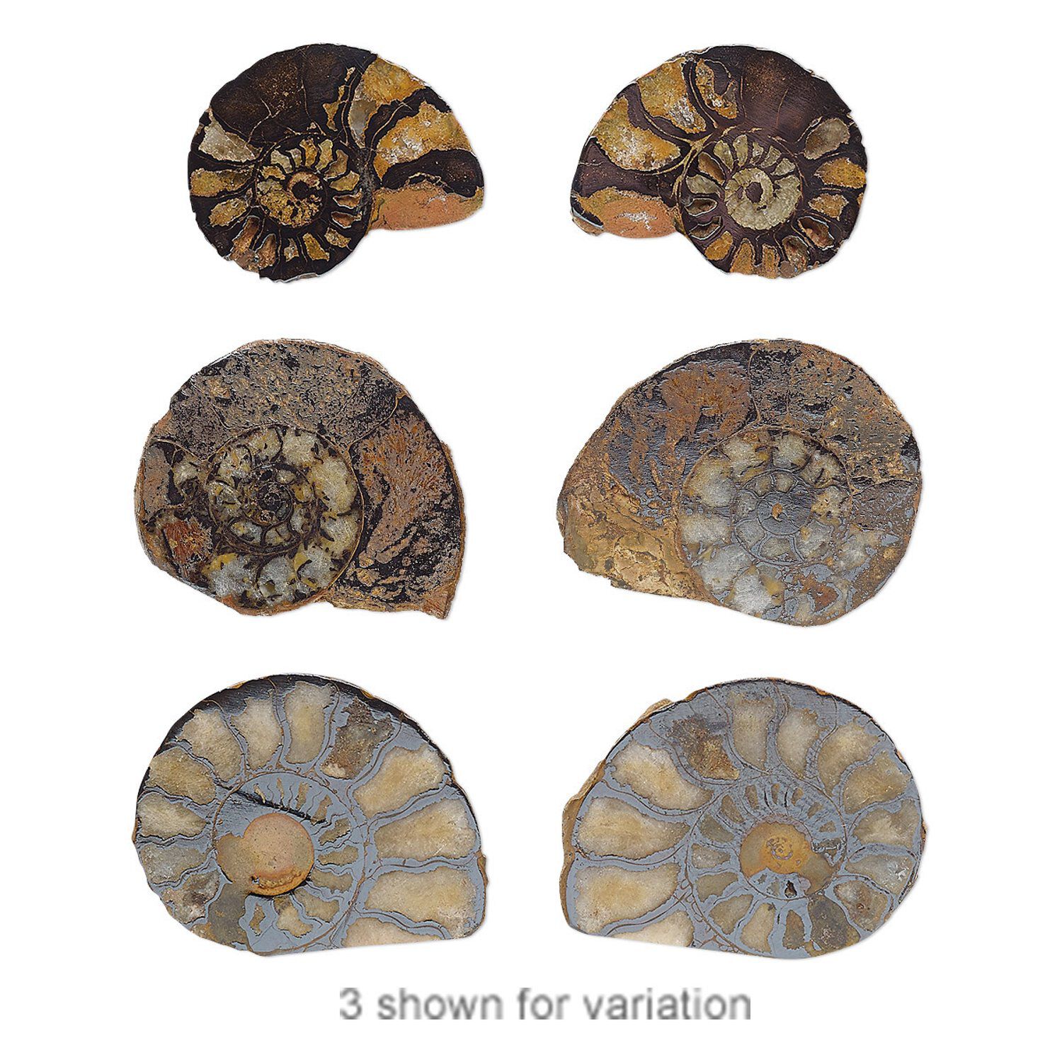 Ammonites are one of the most recognizable fossils and are an extinct group of marine molluscs. Ammonite fossilized spiral shells resemble tightly coiled ram's horns and get their name from the Egyptian god Ammon who is depicted wearing ram's horns. Package contains both left- and right-facing components ideal for use in designs which may require opposite-facing pieces. Components will vary in size, shape and color.
