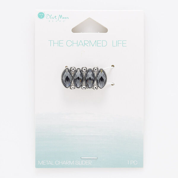 Slide, silver-finished "pewter" (zinc-based alloy) and glass, smoke and clear, 25x13mm fancy rectangle with marquise and 10.5x2.5mm hole. Sold individually.