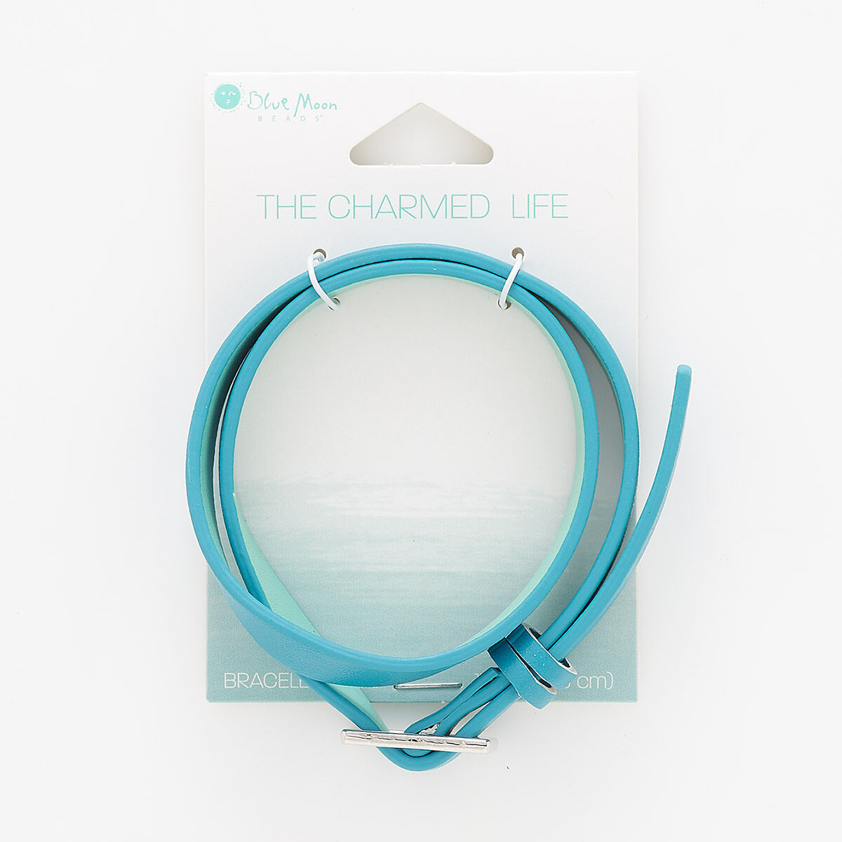 Bracelet, wrap, vinyl and silver-finished "pewter" (zinc-based alloy), turquoise blue, 10mm wide, 17 inches. Sold individually.