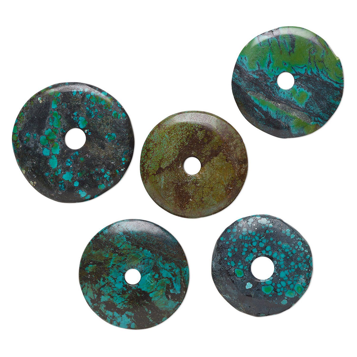 Always in style, turquoise is one of the oldest and most prized gemstones in the world. Focals feature varied dark blue and green tones with heavy brown and black matrix. Donuts range in size from 37-49mm.