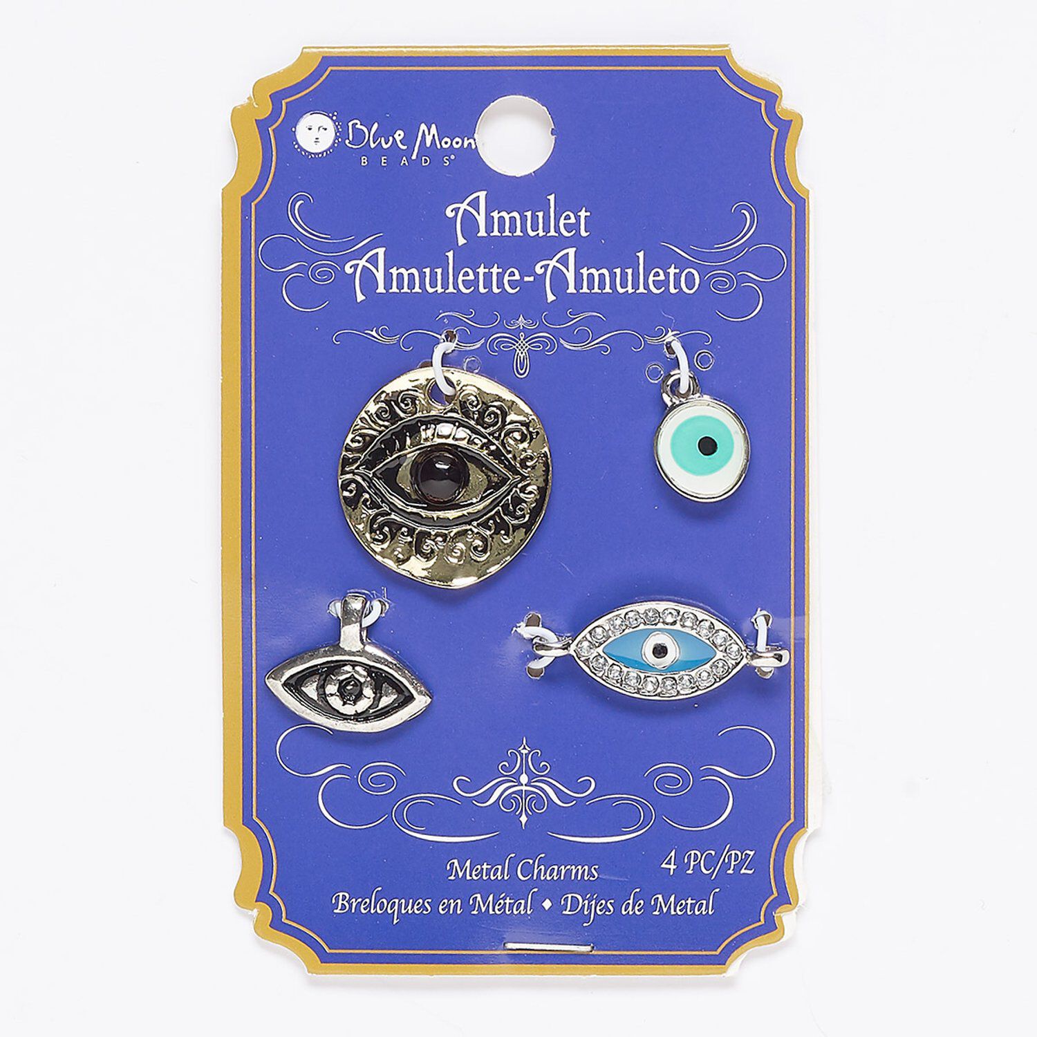 Package contains (1) 22mm double-sided flat round, (1) 11x10mm 2-sided oval with evil eye and "SEEK", (1) 18x10mm single-sided marquise and (1) 18x9mm single-sided marquise.