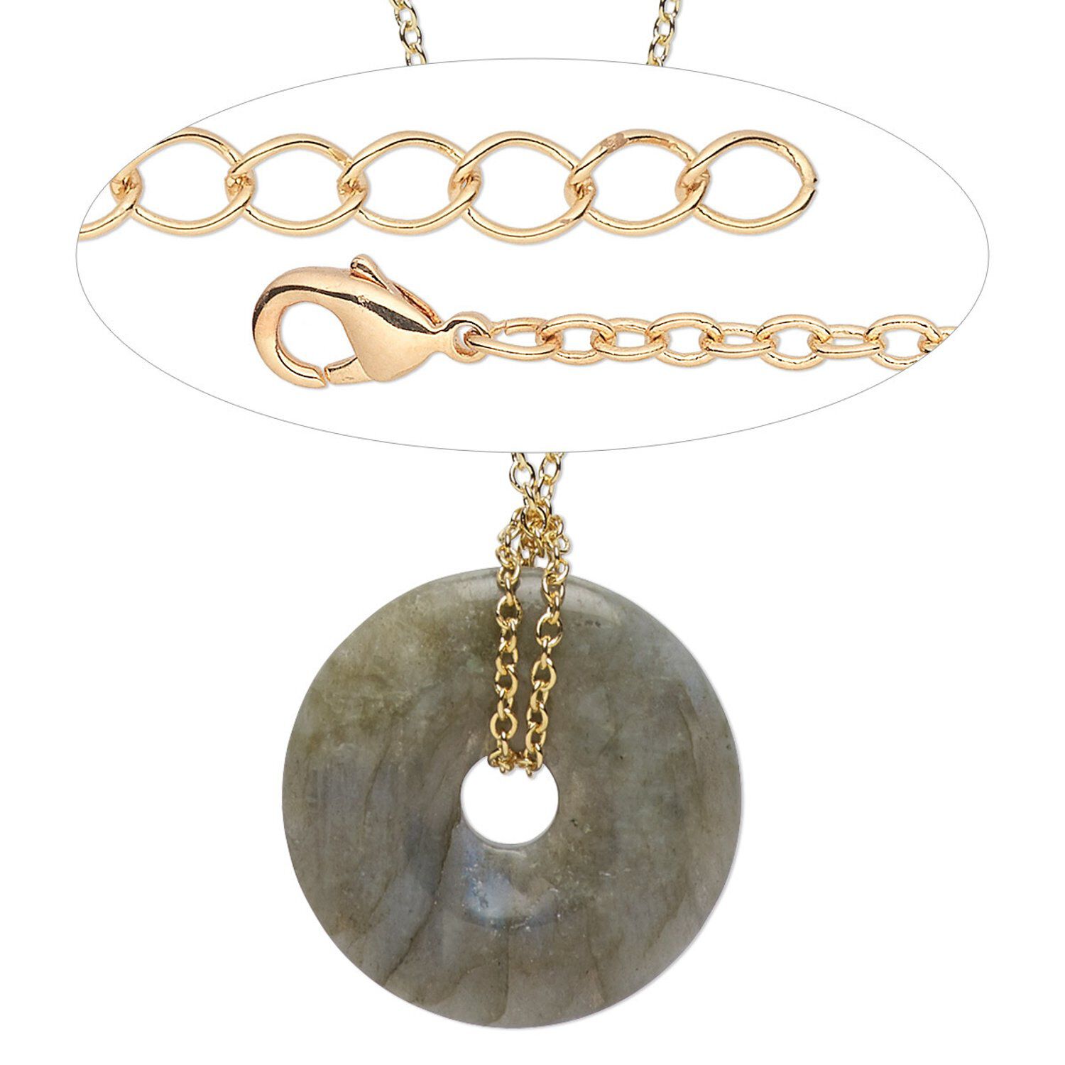 A labradorite round donut swings on a gold-finished brass chain in this necklace. Lark's head knot secures the donut.