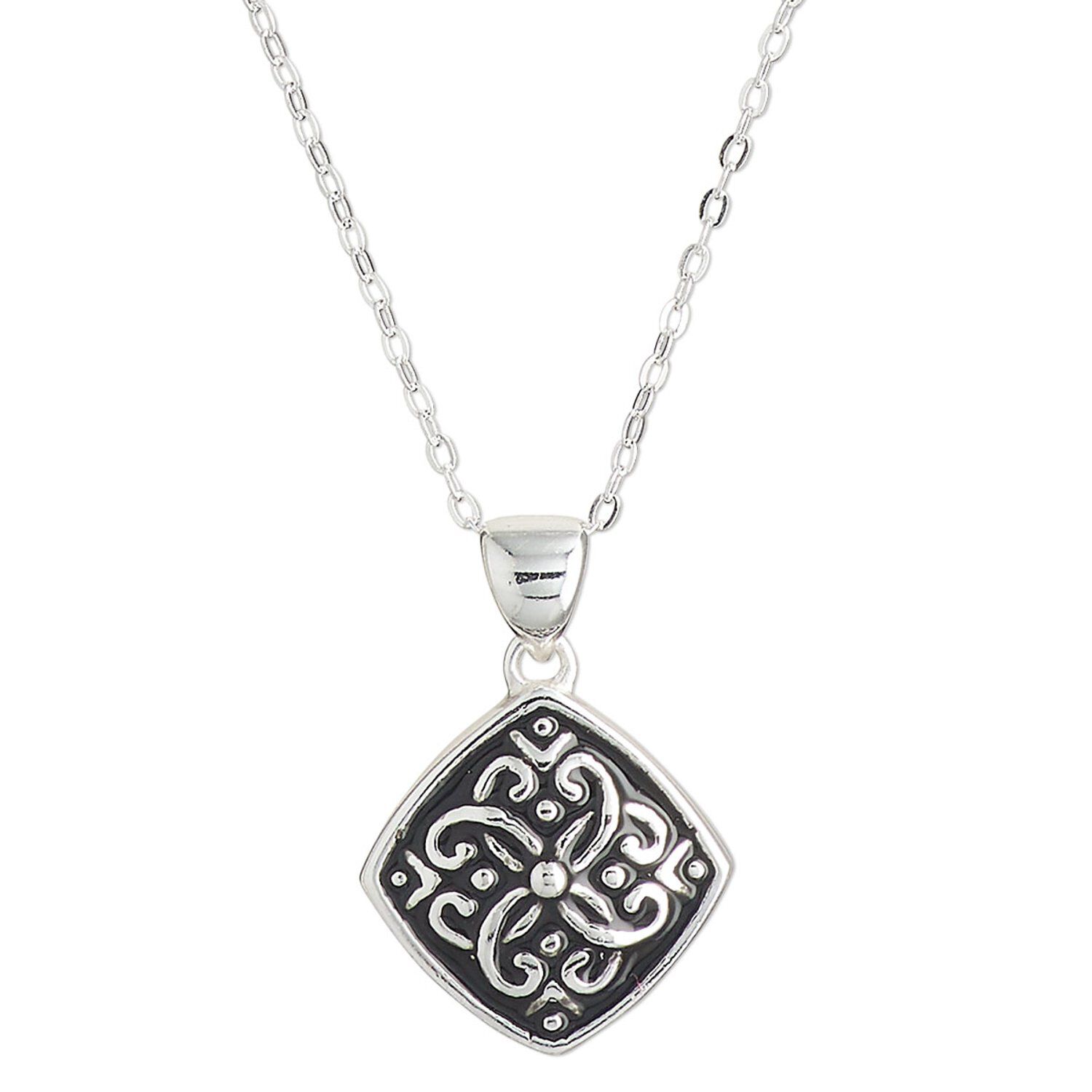 Necklace, Create Compliments®, sterling silver and enamel, black, 15.5mm diamond with dot and swirl design, adjustable at 18 and 20 inches with springring clasp. Sold individually.