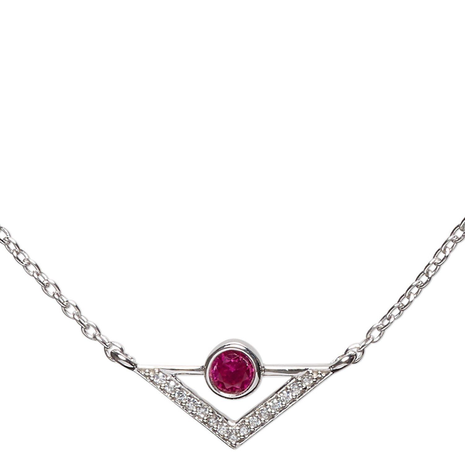 A rhodium-plated sterling silver crescent triangle pendant, set with fuchsia and clear cubic zirconia stones, sparkles on a sterling silver cable chain in this design.