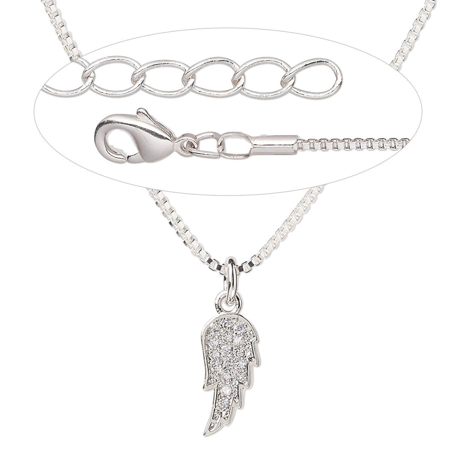 This small silver-plated brass wing charm encrusted in cubic zirconia for a glittering pavé design takes flight from a delicate stylish chain. Silvery charm brings an upscale, designer-quality look with its beauty.