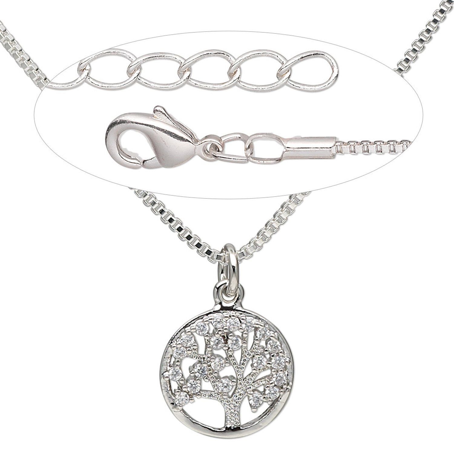 A single-sided tree of life design with glittering cubic zirconia running throughout its branches sits upon a silver-plated brass chain.
