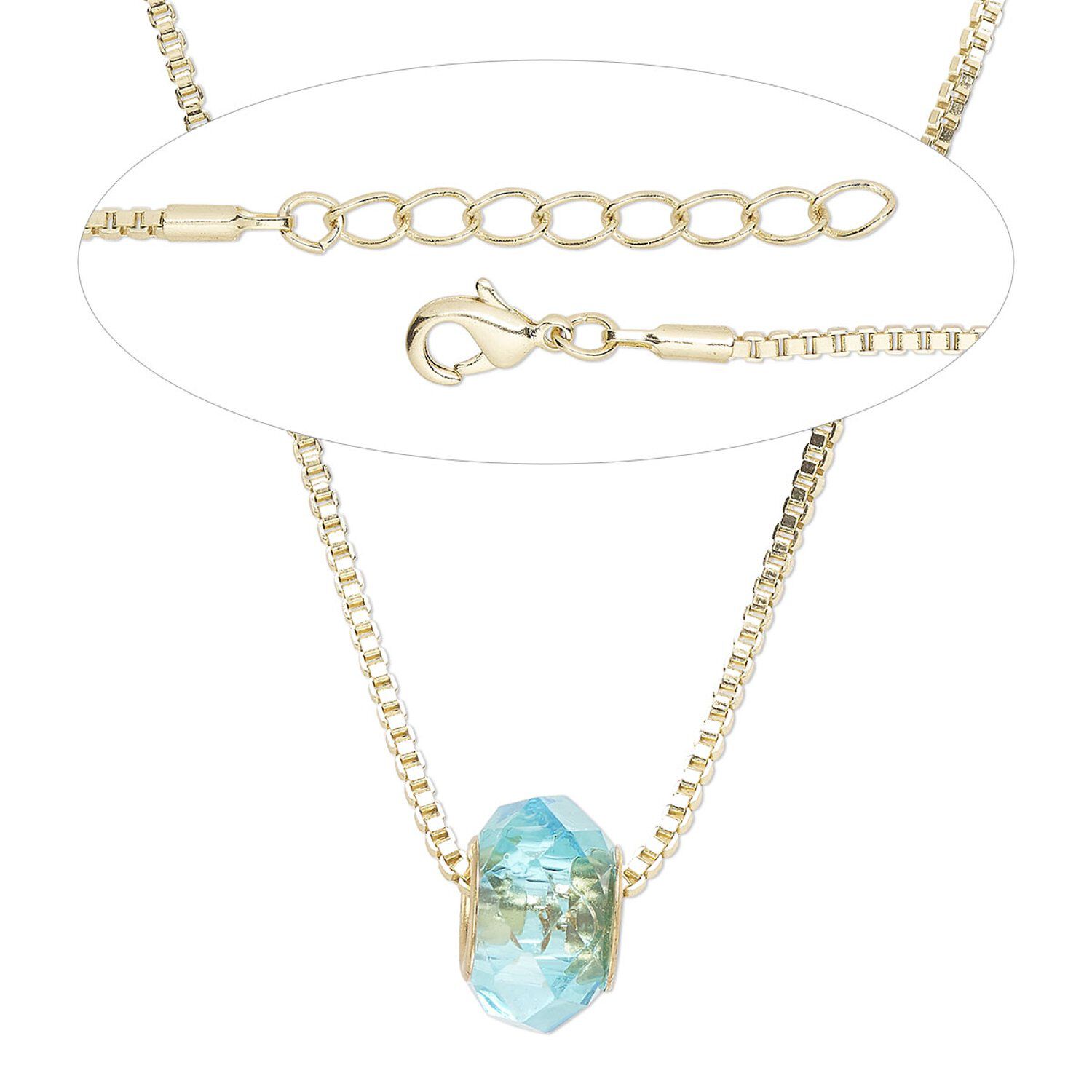 Necklace, Everyday Jewelry™, brass and crystal, turquoise blue rondelle on gold-finished chain with lobster claw clasp, 20 inches. Sold individually.
