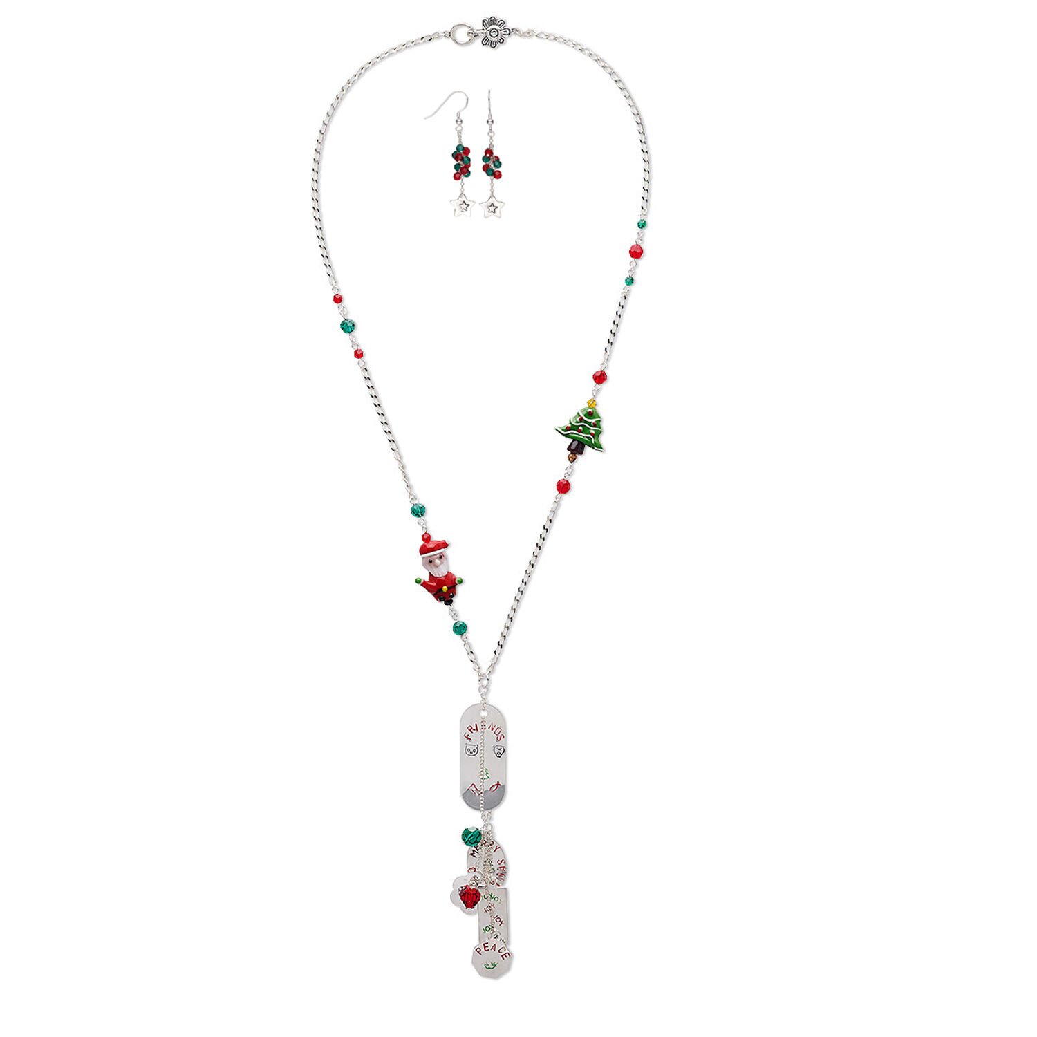Necklace and earring set, One of a Kind Jewelry, sterling silver / crystal / lampworked glass, red / green / multicolored. Only one available.