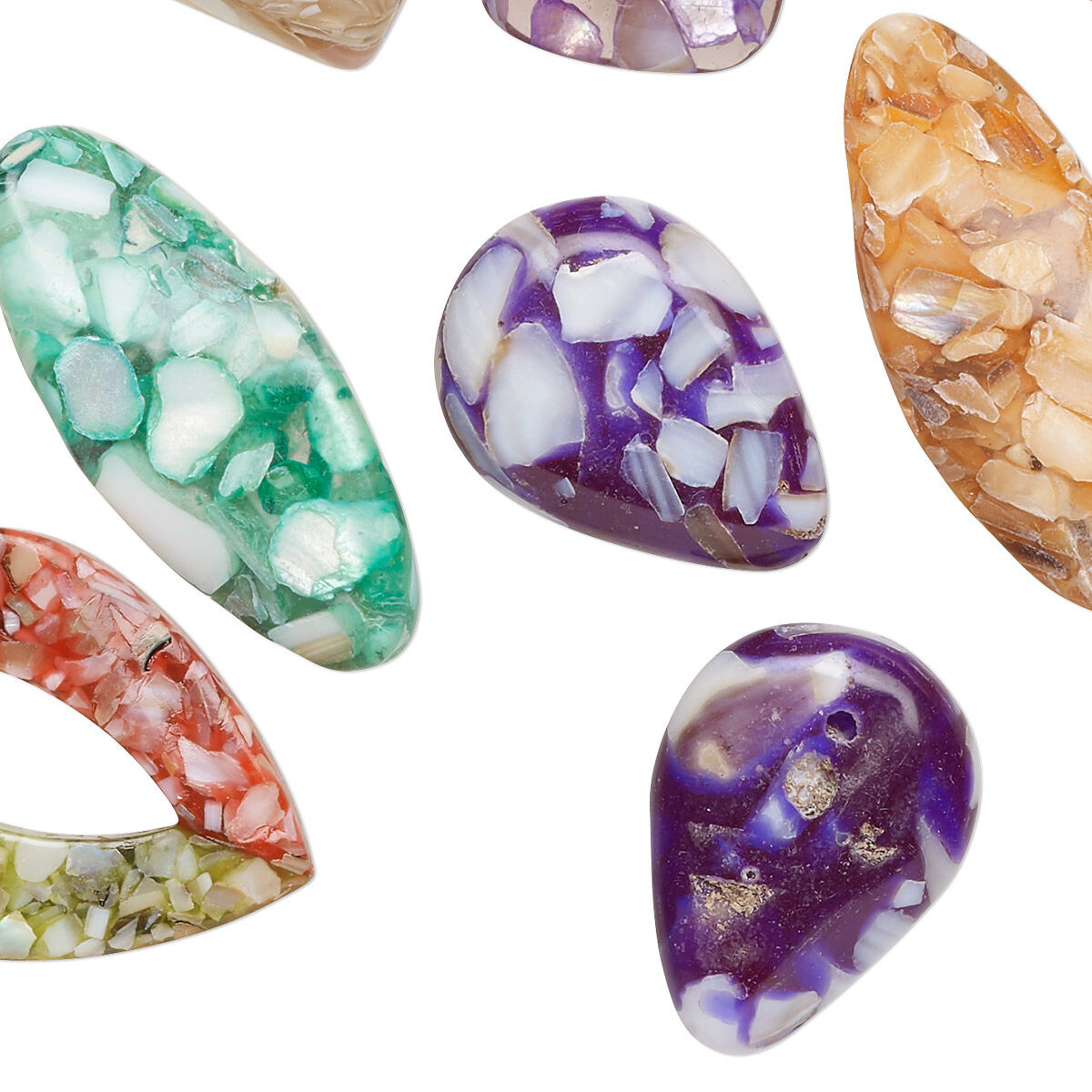 Bead mix, mother-of-pearl shell (assembled) and resin, multicolored, 23x12mm-37x35mm mixed shapes, 11x8mm-20x11mm inside diameter, Mohs hardness 3-1/2. Sold per 3-ounce pkg, approximately 15 beads.