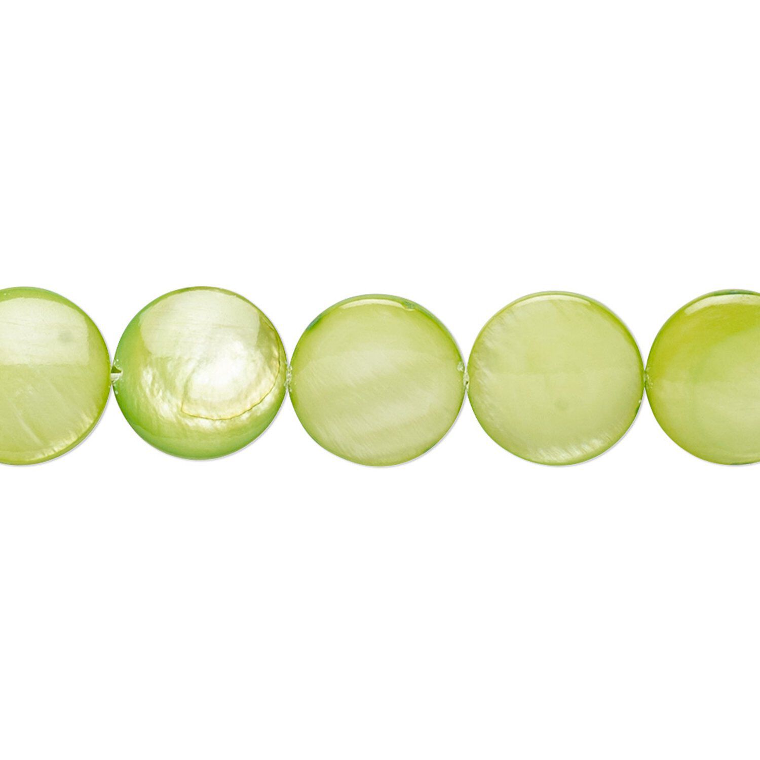 Bead, mother-of-pearl shell (dyed), green, 10-11mm flat round with 0.6-1mm hole, Mohs hardness 3-1/2. Sold per 15-inch strand.