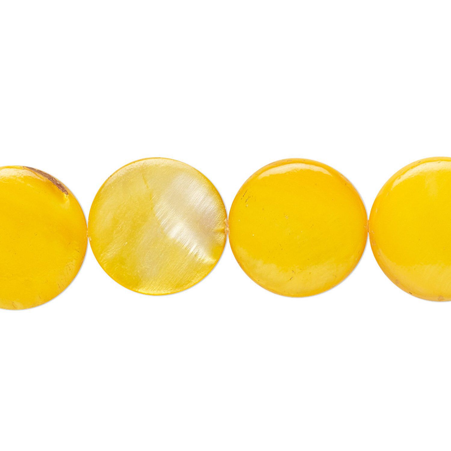 Bead, mother-of-pearl shell (dyed), yellow, 14-15mm flat round with 0.6-1mm hole, Mohs hardness 3-1/2. Sold per 15-inch strand.
