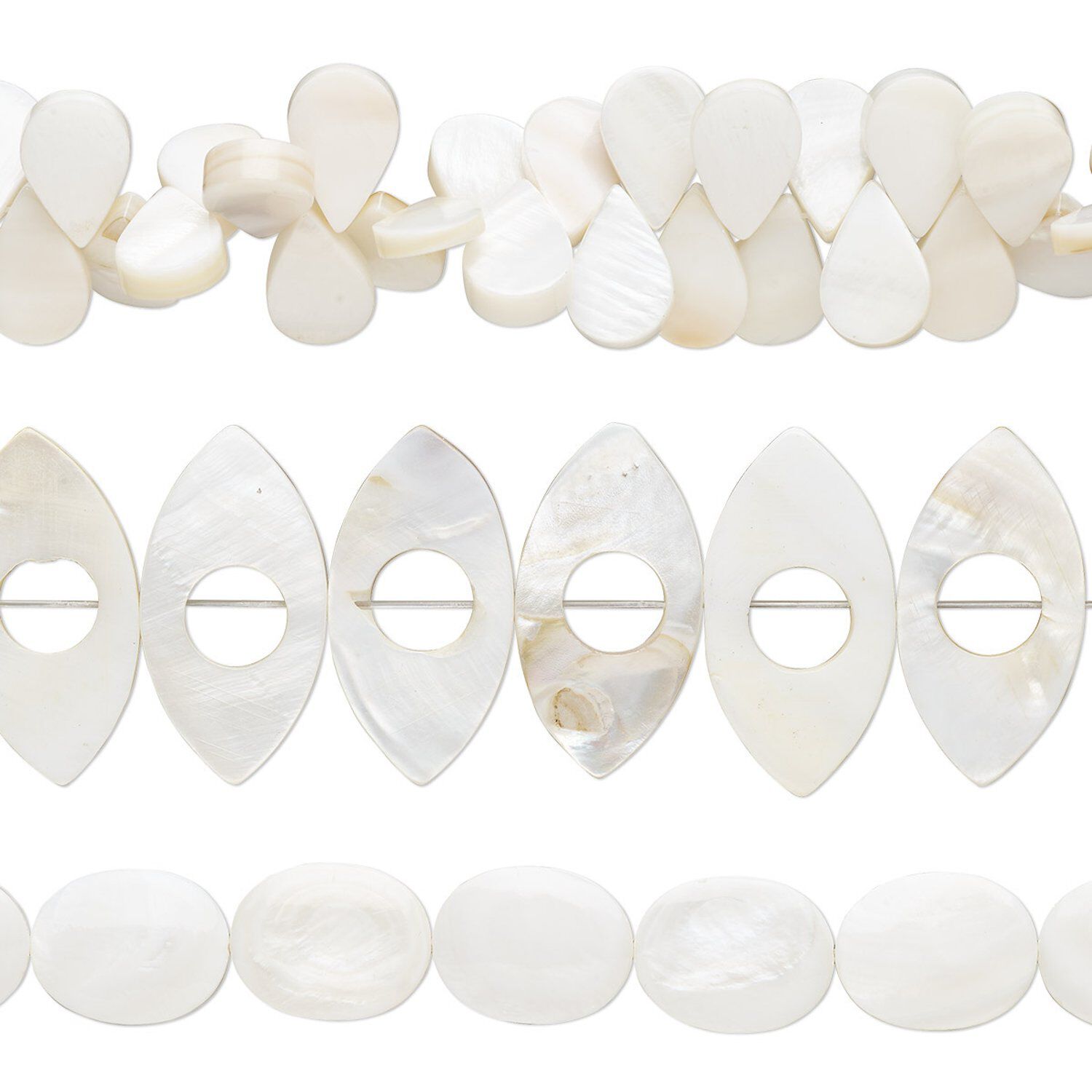 Shapes can include flat marquise, teardrop, flat rectangle and more. Mother-of-pearl shell will vary in color from white to ivory in a variety of hues. Since shell is a natural material, shape, color and size will vary.