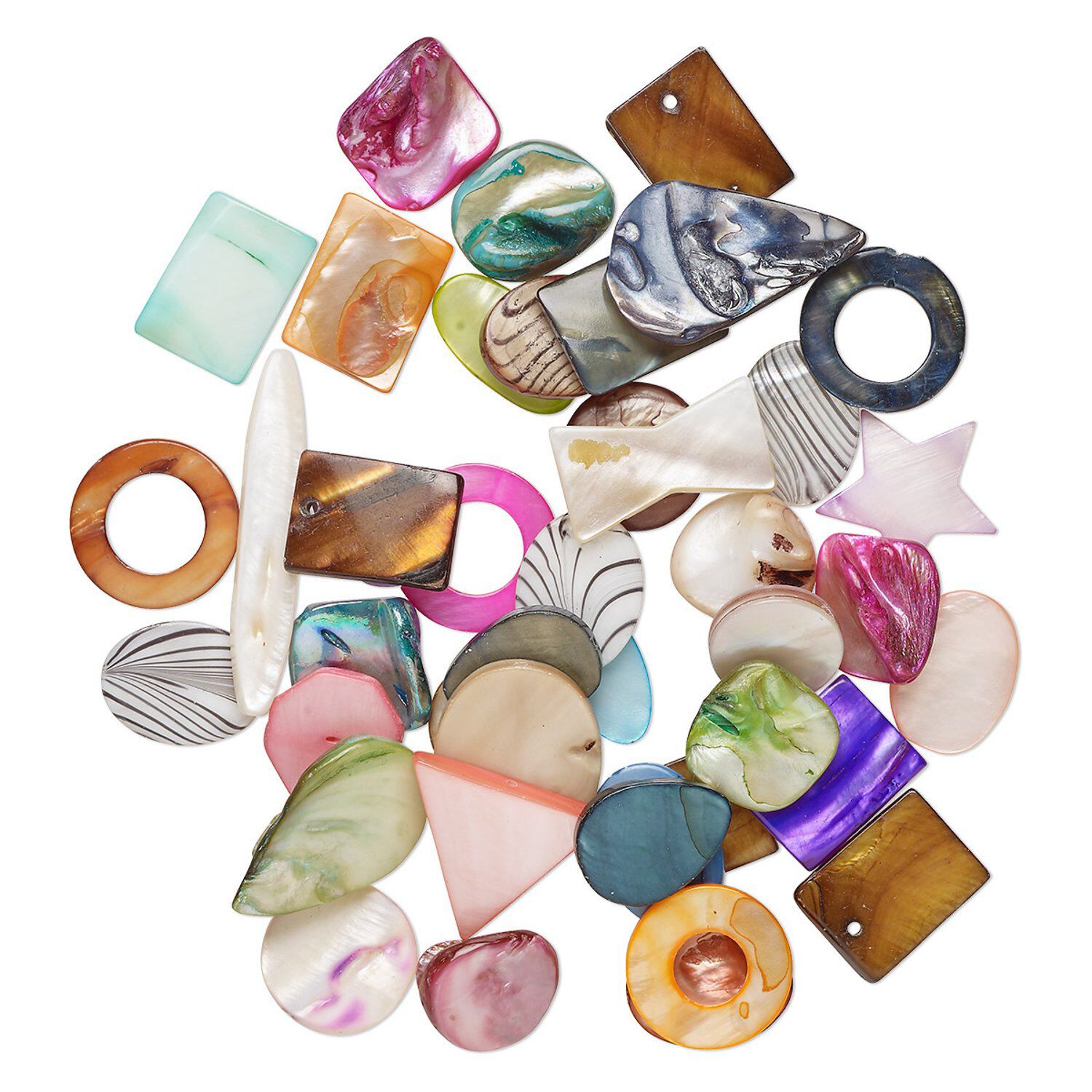 Bead mix, mother-of-pearl shell (dyed), mixed colors, 17x10mm-31x21mm top- and center-drilled mixed shapes with 0.6-0.8mm hole, Mohs hardness 3-1/2. Sold per 3-ounce pkg, approximately 40-50 beads.